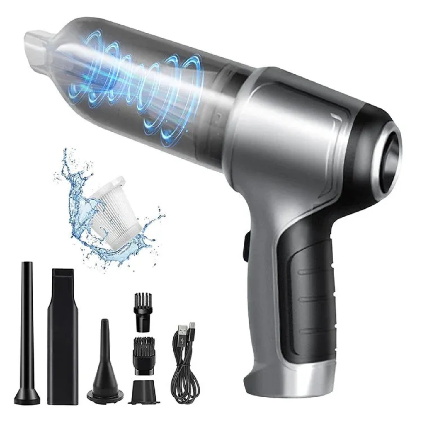 Portable vacuum cleaner + air blower. Multiple attachments included. USB rechargeable. Great for cleaning cars, keyboards, and other small spaces. Easy to use and store.