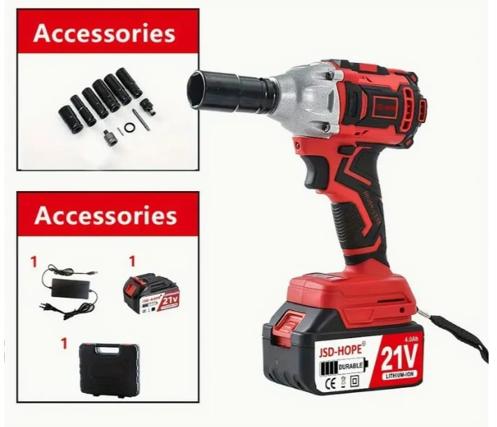Selling a cordless impact wrench in red and black. It comes with a 21V lithium-ion battery, charger, and a set of accessories. Also includes a durable carrying case for easy storage and transport
