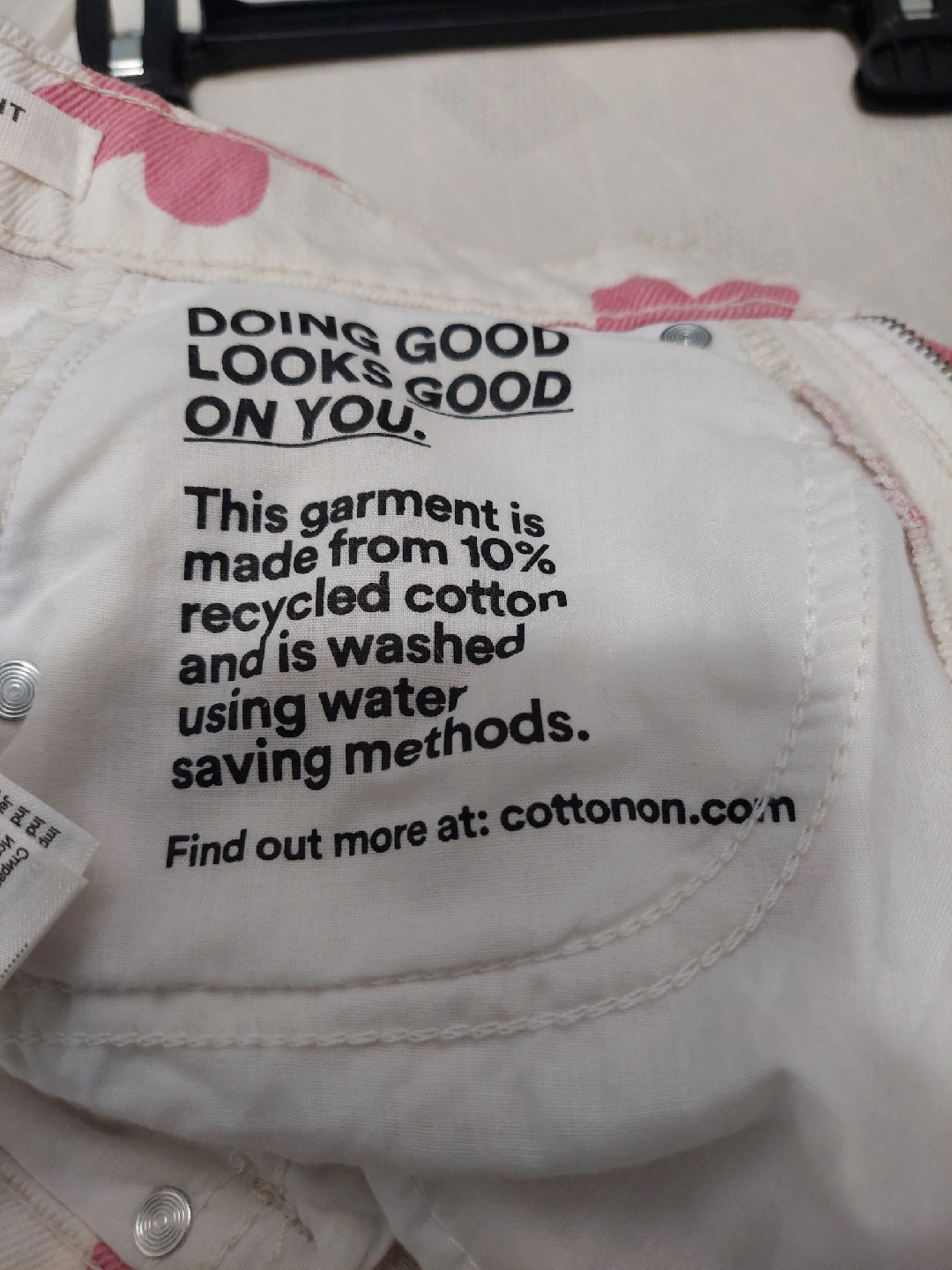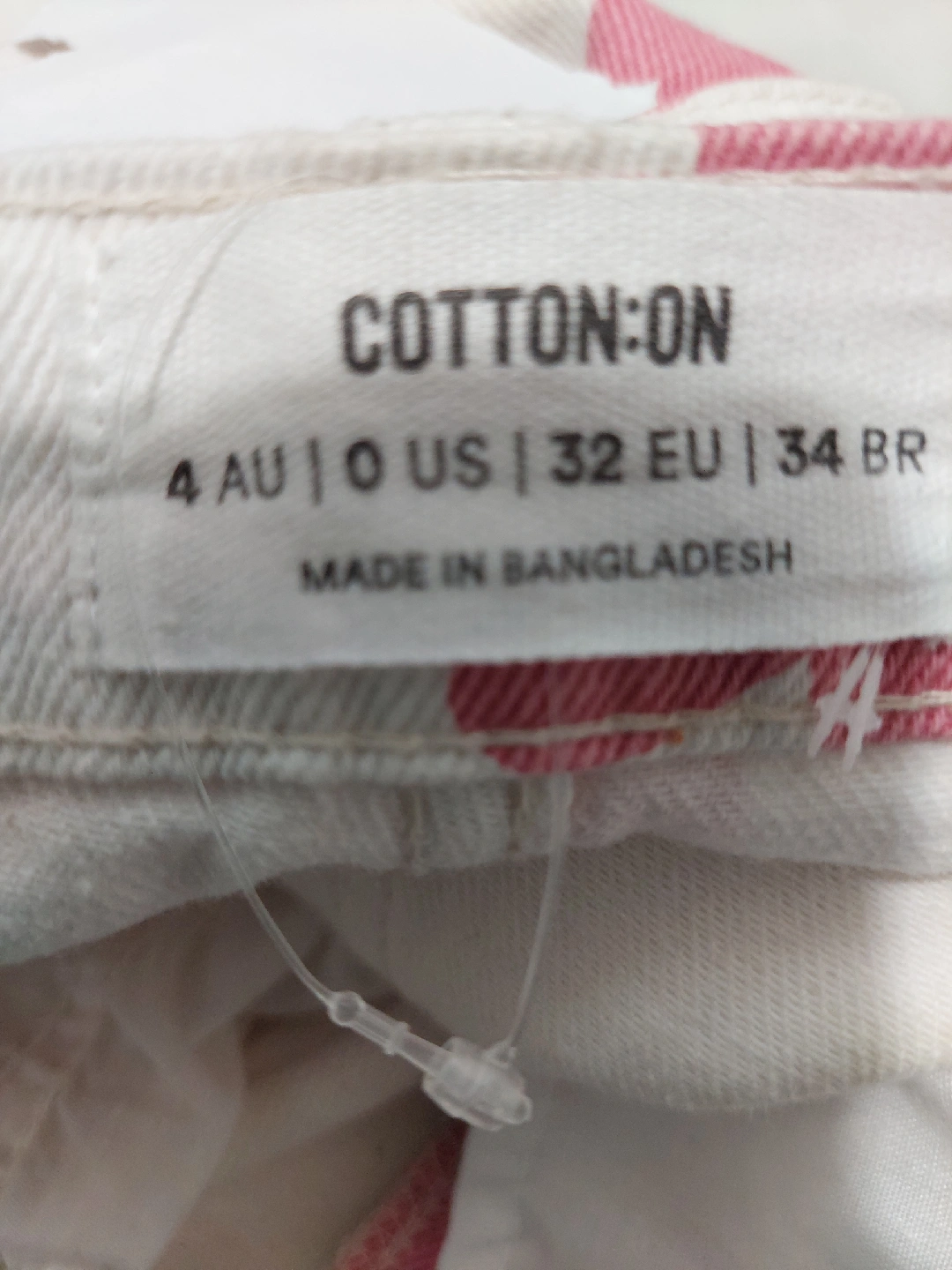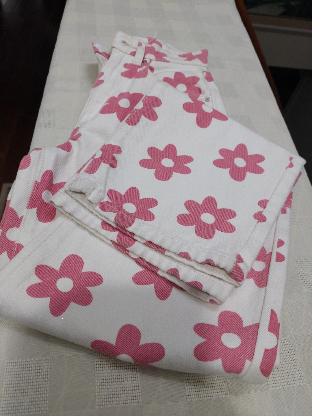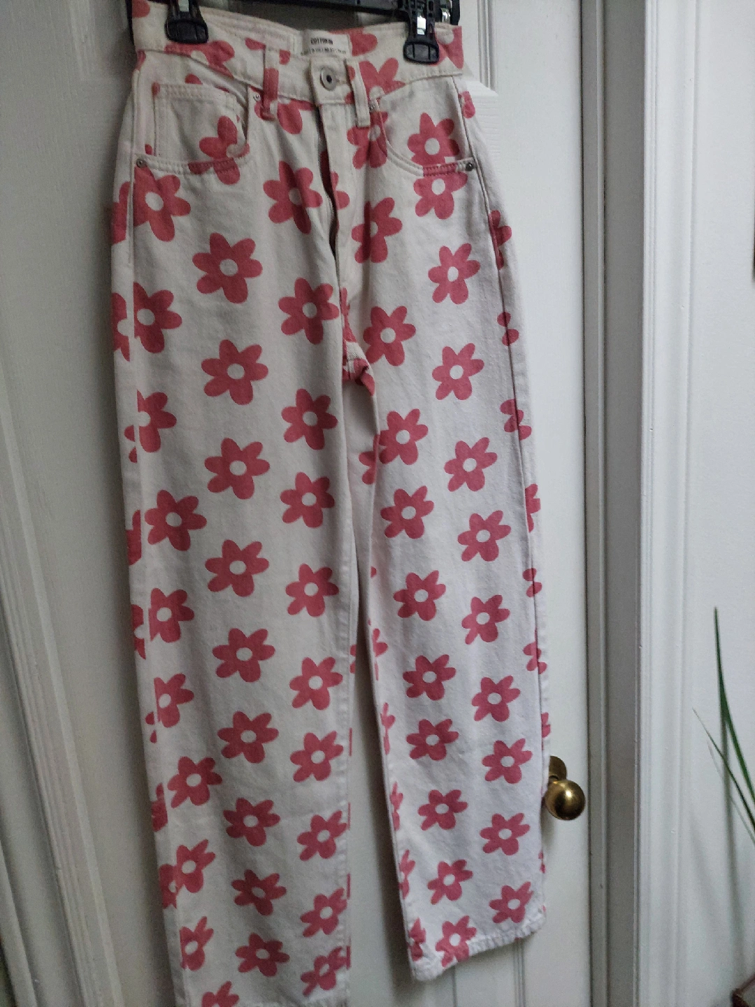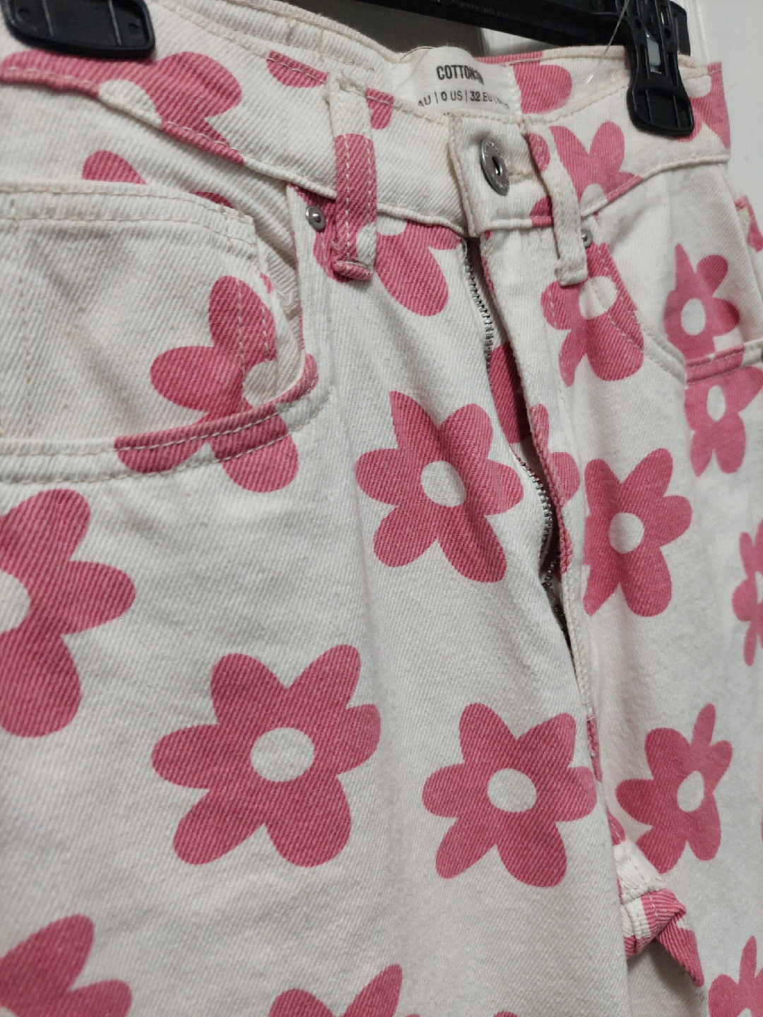 These Cotton On loose straight jeans are super cute with a pink flower pattern on a off-white background. They're a women's size 4. Perfect for adding a pop of colour to your wardrobe!