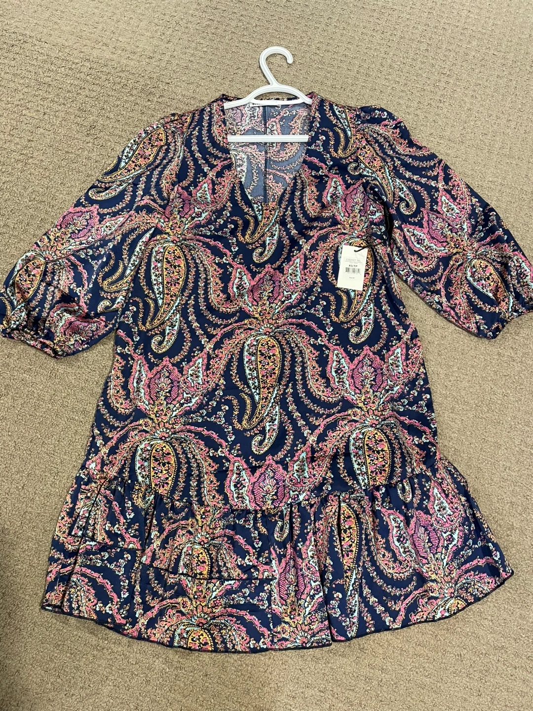 This is a brand new dress with a dark purple paisley pattern! It's a size XS and would be a great addition to your wardrobe. The original price was $34.97