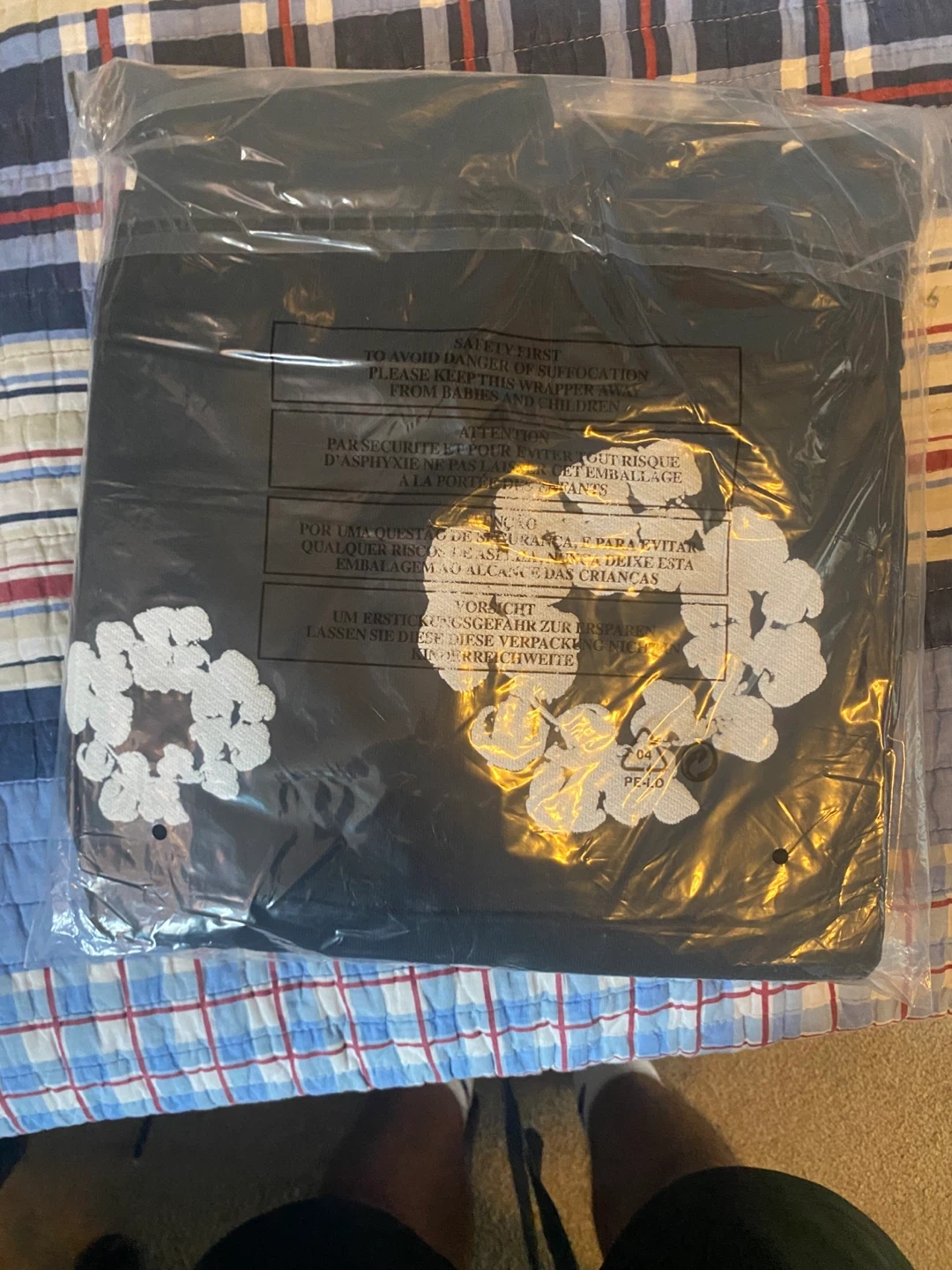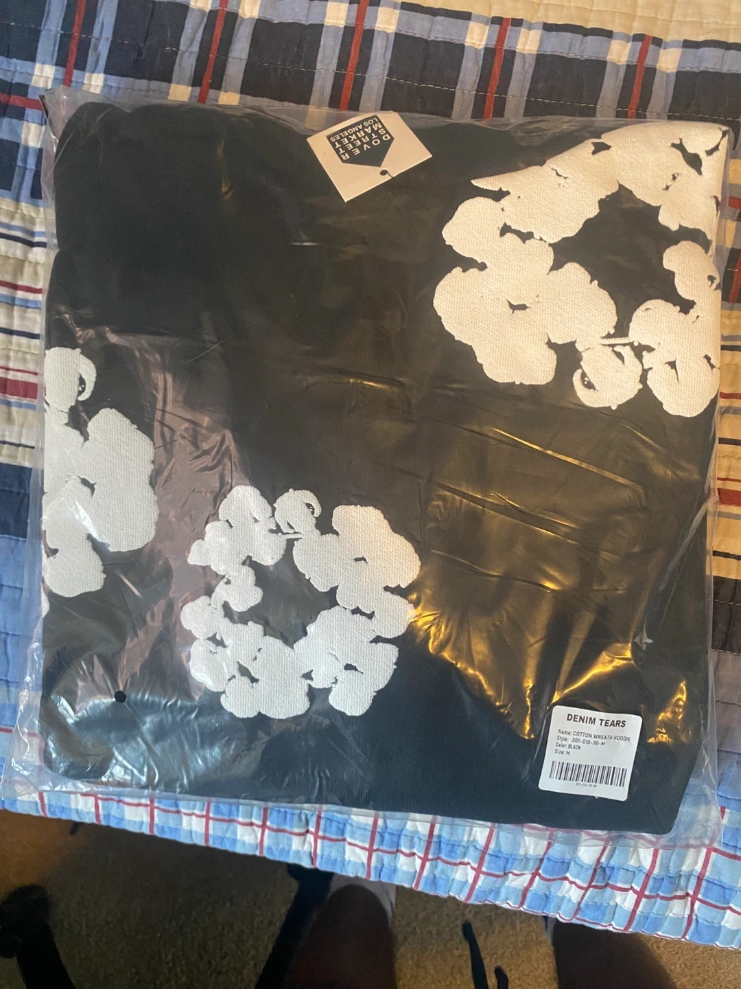 Selling a brand new Denim Tears Cotton Wreath Hoodie in black! It's still in the original packaging and ready for a new home. This stylish hoodie features a unique wreath design and is made of comfortable cotton material. Size is M. Check my profile for more clothing options