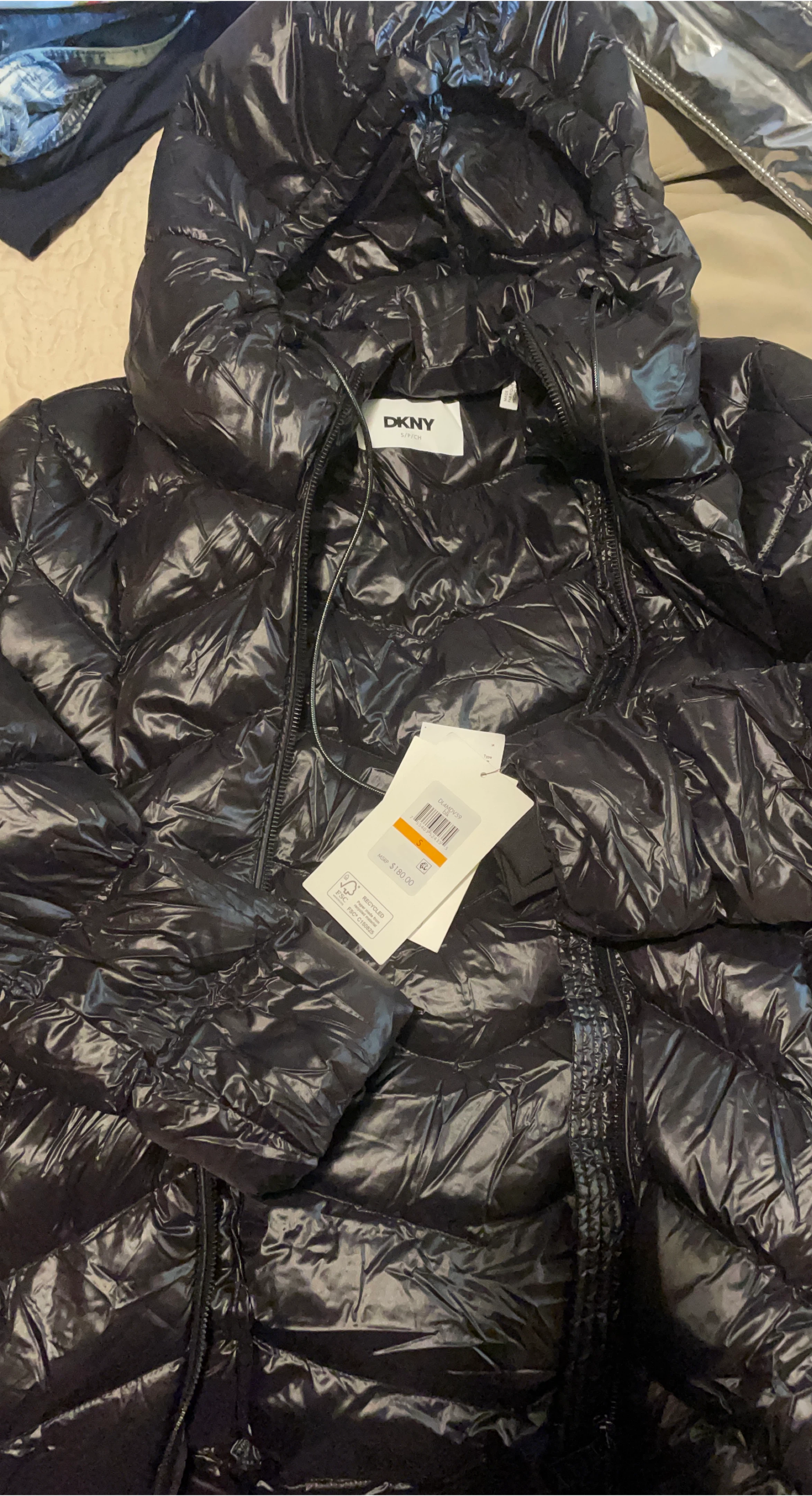 Selling a brand new with tags DKNY puffer jacket in size small. It's a stylish black colour and is in perfect condition. The MSRP on the tag shows $180.00