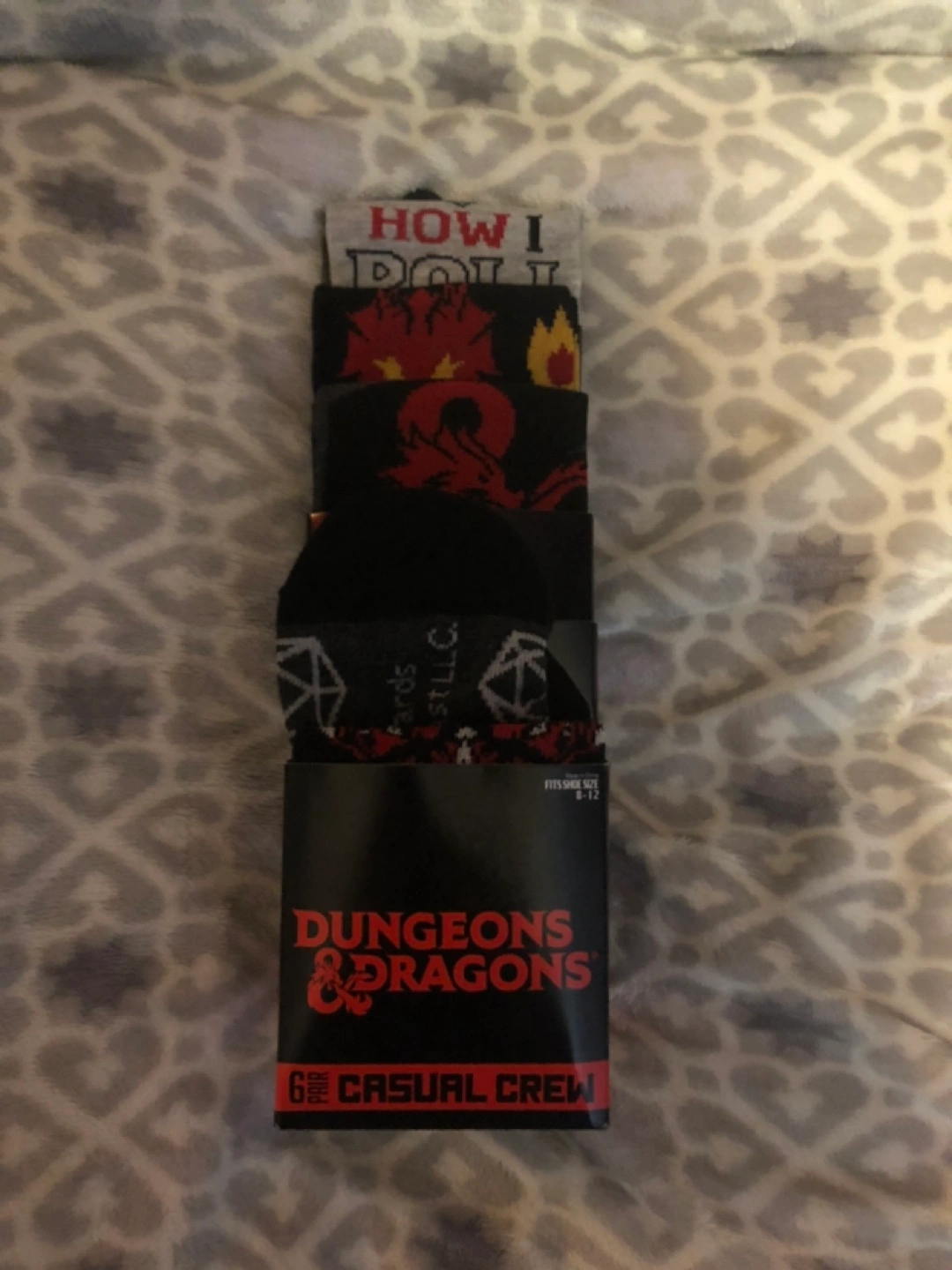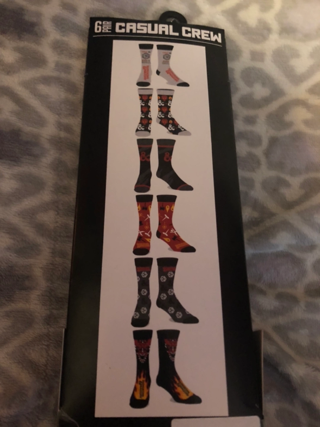 Six pairs of crew socks. Dungeons & Dragons theme. Various designs. Size 9-12.