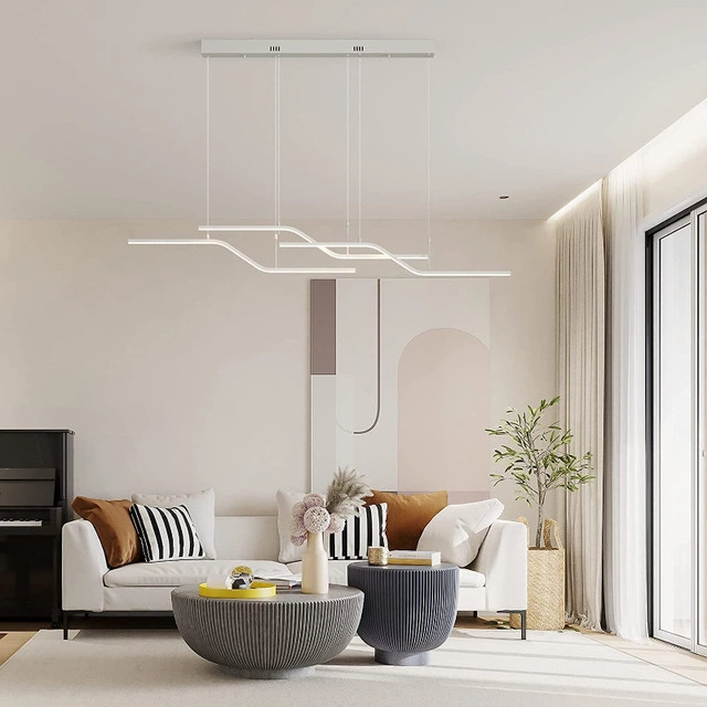 Brand New Light fixture. It comes pre-assembled in original box with hanging hardware and remote. Retails at Amazon for $282 ($250 + tax). Save your money. Pickup from south London. I can deliver in London for an extra fee. Eiinee Pendant Light Fixtures, Modern Dimmable LED Hanging Pendant Light with Remote, Z-Shaped Modern Chandelier Kitchen Island Light Fixtures for Dining Living Room Hallway (45W, White) Product details: Brand: Eiinee Colour: milky White-dimmable-45w Material: Aluminum, Silicon, Metal Style: Modern/Simple/Elegant Light fixture form: Chandelier Room type: Lobby, Kitchen, Bedroom, Living Room, Hallway, Dining Room ✅【Stepless Dimming Pendant Light & Memory Function】——High quality LED light source fully dimmable with remote control from warm light (3000K) to white light (6000K). Brightness: 10-100%. Memory function of LED modern chandelier can be realized, which is more convenient. ✅【Modern Aesthetics White Chandeliers】——The geometric pendant lighting unique design is an eyecatcher that perfectly complements the contemporary designed living area. With attractive look, it is also a true highlight during the day. ✅【Adjustable Suspension Wire & Selected Materials】——Power:45W. Lumen:3600LM. Length: 133cm/52.4''. Width: 20cm/7.9''. Suspension wire (120cm/47.2'') can be adjusted to the appropriate height. Max Height:132cm/52''. ✅【Energy-Saving & Efficient】——LED embedded in the modern pendant light fixture, can’t be replaced but has a long service, average 40,000 hrs. LED pendant light is made of high-quality aluminum and high-transparent silicon. High light transmission, rust protection, corrosion protection, good durability. ✅【Easy to Instal & Widely Used】——Assembly free, you just need to open the package, and install directly. The hanging pendant light chandelier fits your Dining Room, Living Room, Bedroom, Hallway, Staircase, Foyer, Office, Study, etc. Offer you a charming ambiance with bright light source