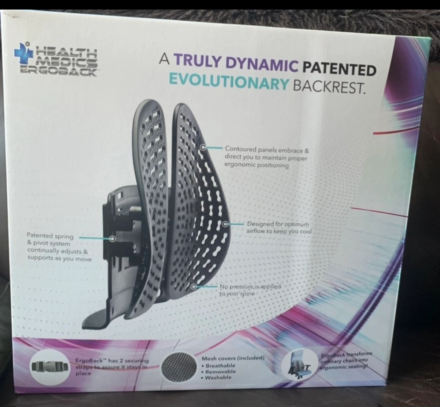 New in box back support for office chairs, car seats or home seating. It has dynamic pivot system that allows the two panels to move with the natural curvature of your back, as you move to provide sustained ergonomic support vs. the traditional statice back supports on the market. I was unable to use this because my spine curves differently than the average person’s.