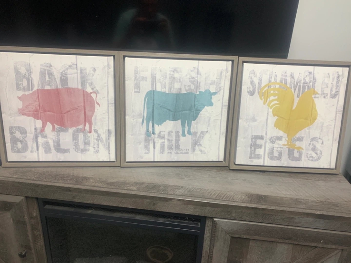 $20 for ALL three! Selling these farmhouse-style kitchen wall art pieces with beautiful solid wood frames. They feature designs like a rooster with 'Scrambled Eggs,' a cow with 'Fresh Milk,' and a pig with 'Back Bacon'. Perfect for adding a touch of country charm to your kitchen. Gorgeous and not a scratch on them.