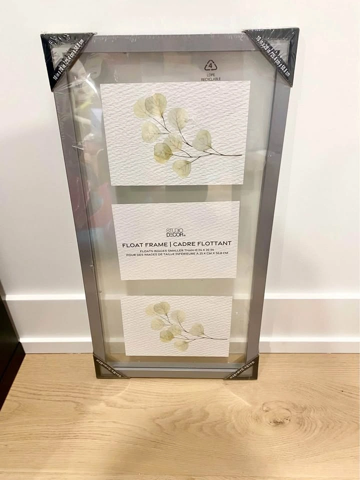 New in package float frame by Studio Decor. 10” x 20” Grey frame colour Purchased at Michael’s for $24 Pick up in East York at O’Connor & Greenwood.