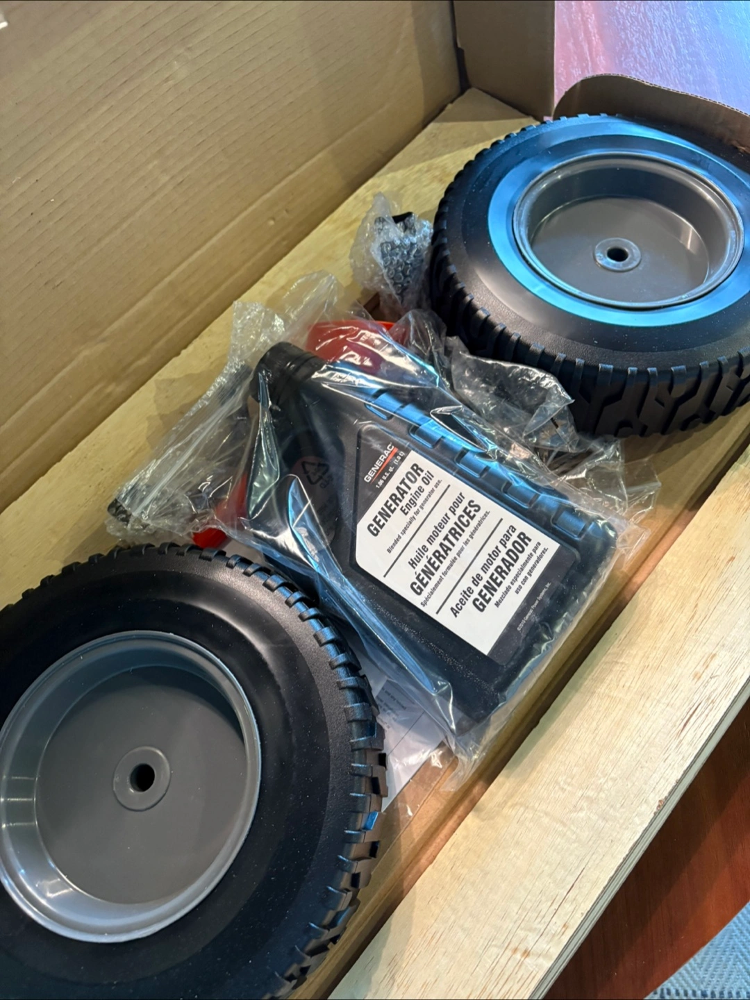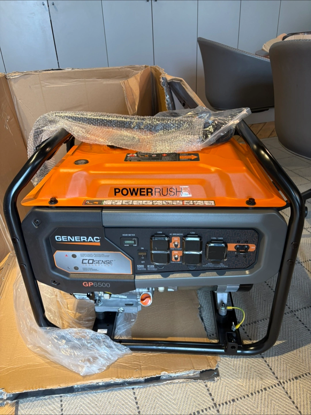 Selling a brand new Generac GP6500 portable generator. It's still in the box and comes with all the original components, including the wheels and oil. This generator features PowerRush technology and has a large-capacity fuel tank. Perfect for emergencies or outdoor projects!