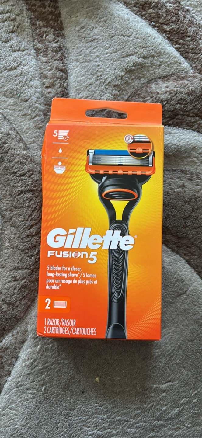 Selling a brand new Gillette Fusion5 razor. It comes with 2 cartridges for a closer, long-lasting shave! The packaging is in both English and French.