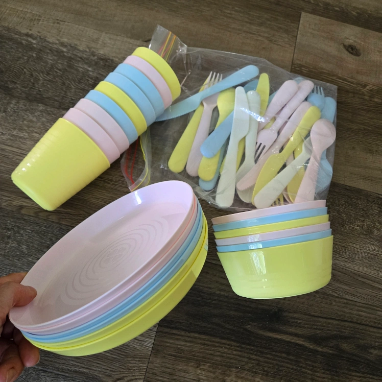 Selling a NEW set of IKEA pastel-coloured plastic dishes for kids! Includes plates, bowls, cups, and cutlery. Perfect for picnics or everyday use, these are lightweight and easy to clean!