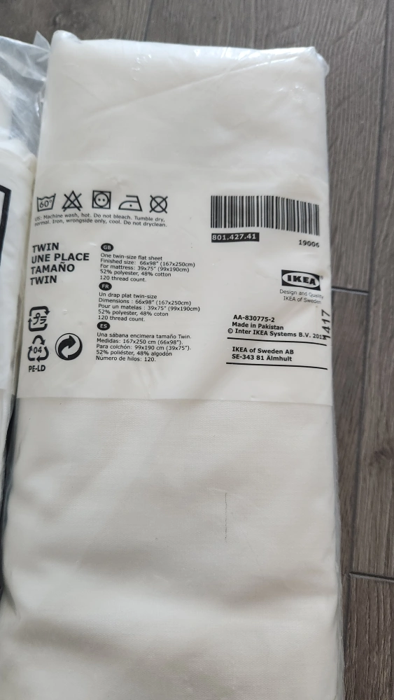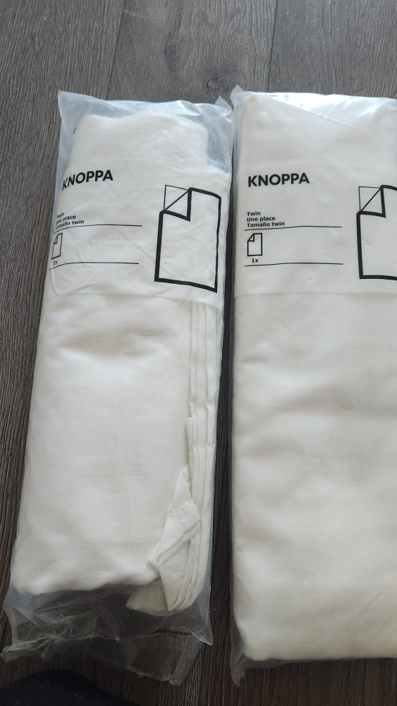 Selling a brand new IKEA Knoppa twin flat sheet, still in its original packaging! It's white, made of 52% polyester and 48% cotton. The size is 167x250 cm (66x98"). Perfect for a twin-sized bed