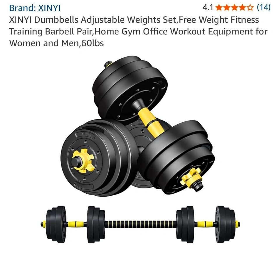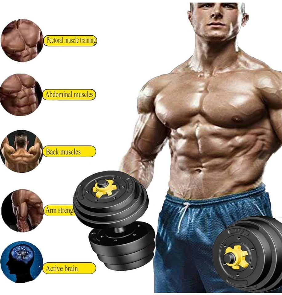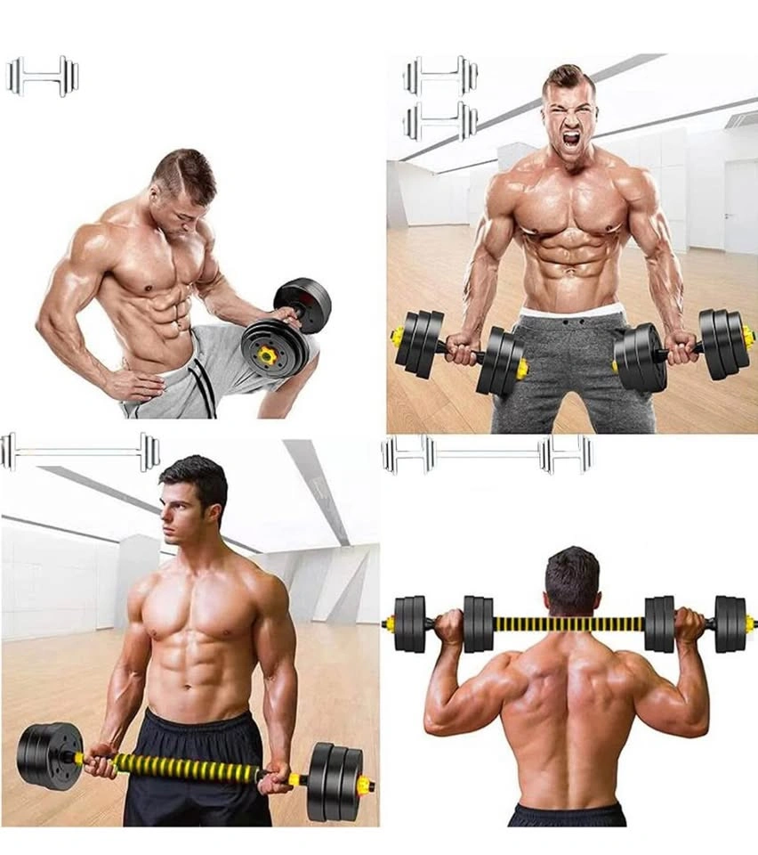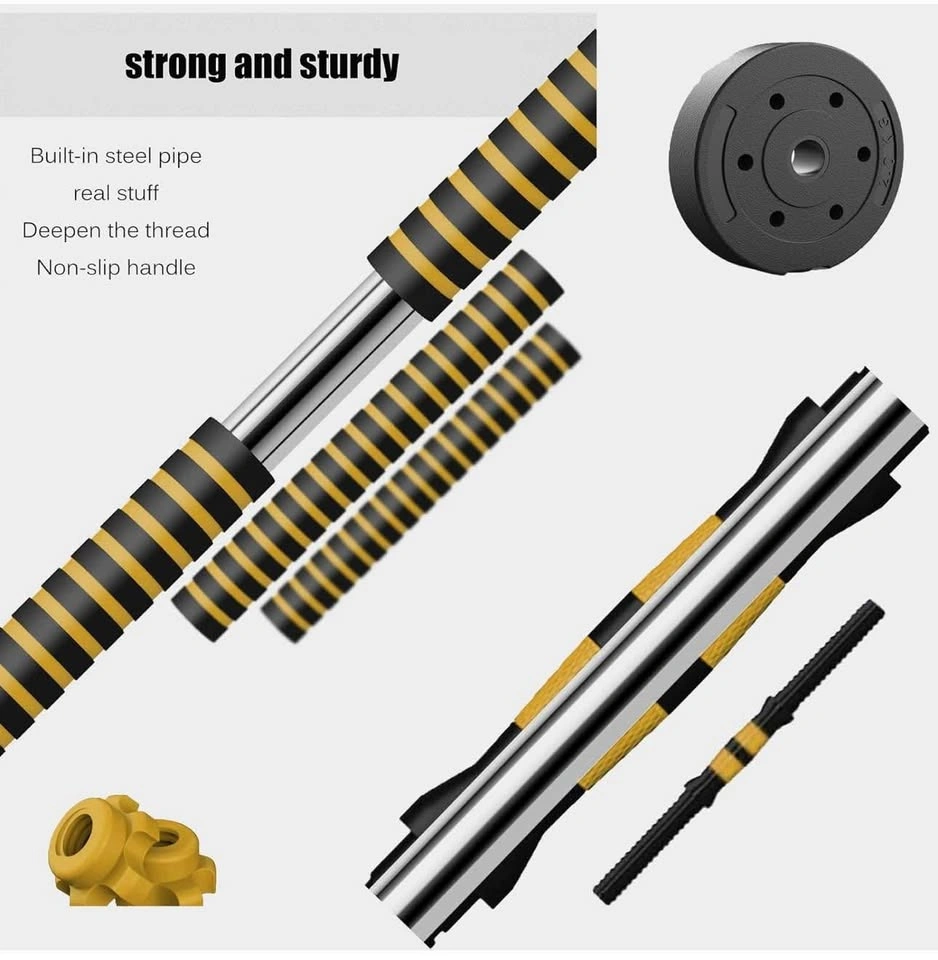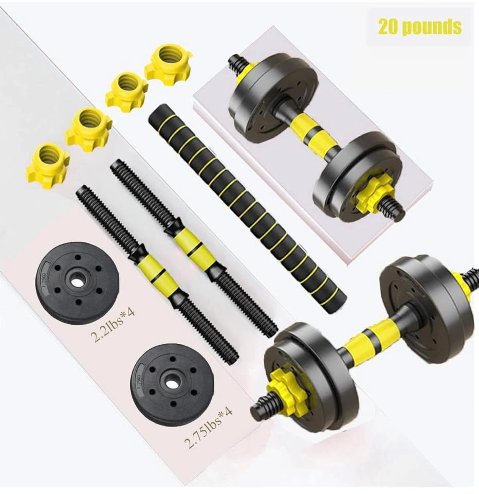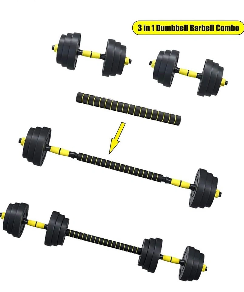 Our all-in-one dumbbell-barbell set is perfect for improving overall health or encouraging weight loss. With this dumbbell barbell set, you can do all kinds of exercises to strengthen the upper body, core muscles, and lower body. The adjustable design makes it easy to stay fit at home. Our adjustable dumbbells set comes with a connecting bar that can be easily attached to both dumbbells to transform into a barbell. There are also adjustable weight plates that let you customize the weight of the dumbbell/barbell to your desired setting. Each dumbbell handle and connector are made of solid steel. The dumbbell handle has a rough rubber coating, and the connector has thick foam, allowing you to control your weight well and feel safe while doing your workout. The design of the color rubber ring not only avoids noise, but also does not harm the floor. This dumbbells barbells set comes with 12 weight plates: four 4.4 lb. plates ,four 5.5 lb. and four 6 lb. plates. Each dumbbell handle weighs 0.6 lbs. The lowest weight you can adjust to for each dumbbell is 0.6 lbs, with no plates attached. The highest weight with all the plates attached is 32 lbs. Weights can be added or taken off in 4.4 lb.,5.5lb or 6lb. increments. The barbell rod weighs 0.5 lbs., so the barbell can be adjusted from 1.7 lbs to 66lbs. Pick up - Courtice Please check my other listings.