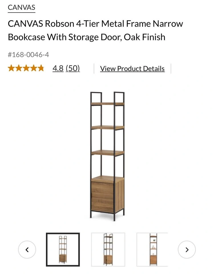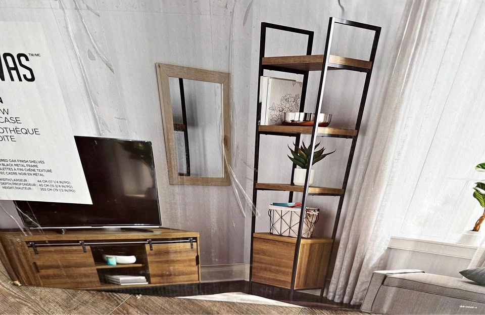 New in box Canvas Robson bookcase with metal and oak frame. Features a modern, stylish design that would complement any home décor. Cabinet door can hinge on left or right end for added versatility. Oak finish and powder coated uprights for increased durability. Engineered wood with textured oak finish and matte black metal frame. 4 open shelves for convenient storage. Assembly required. Coordinates with CANVAS Robson Wide 5-Shelf Bookcase (CT# 168-0047) and CANVAS Robson Media Stand (CT# 168-0048). Dimensions: 17.32" W x 15-3/4" D x 79.53" H. Colour: Brown Pick up - Courtice Please check my other listings!