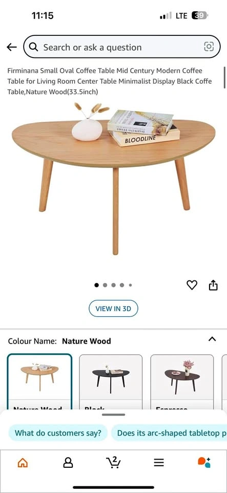 The tabletop is like a big mango. The smooth arc-shaped wide tabletop makes your living room cute and practical, more delicate than ordinary coffee tables. The Espresso oak woodgrain pairs well with your existing décor. The round coffee table legs are all made of natural solid wood, providing reliable support. The water resistant finish allows you to easily clean spills by wiping with a damp cloth. Assembled dimensions: 23.63"D x 47.3"W x 17.72"H. The table top can hold up to 150 lbs. The minimalistic design is perfect for dorm rooms and small apartments. This mango-shaped dark walnut coffee table is a classic minimalist chic that will suit any style of room. Firminana Mango oval coffee table comes with detailed instructions and simply attach the 3 legs to begin using. There is extra silent anti-abrasion foot pads for easy movement without damaging the floor. Pick up - Courtice Please check my other listings!