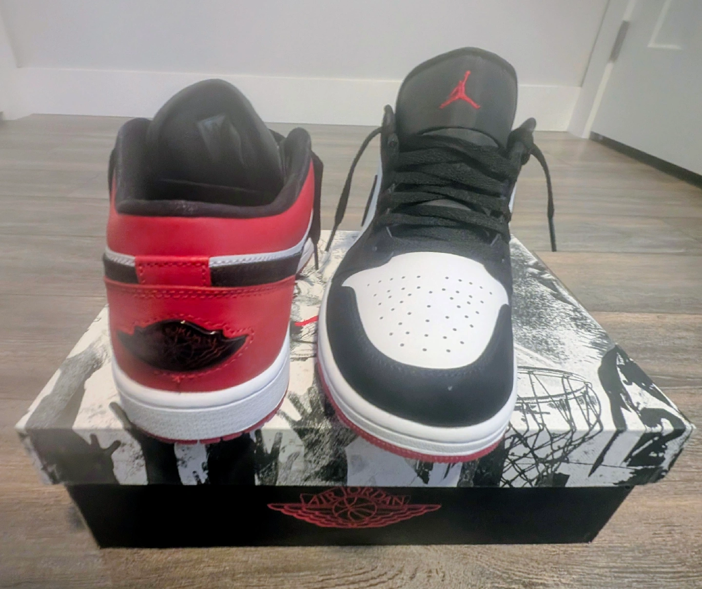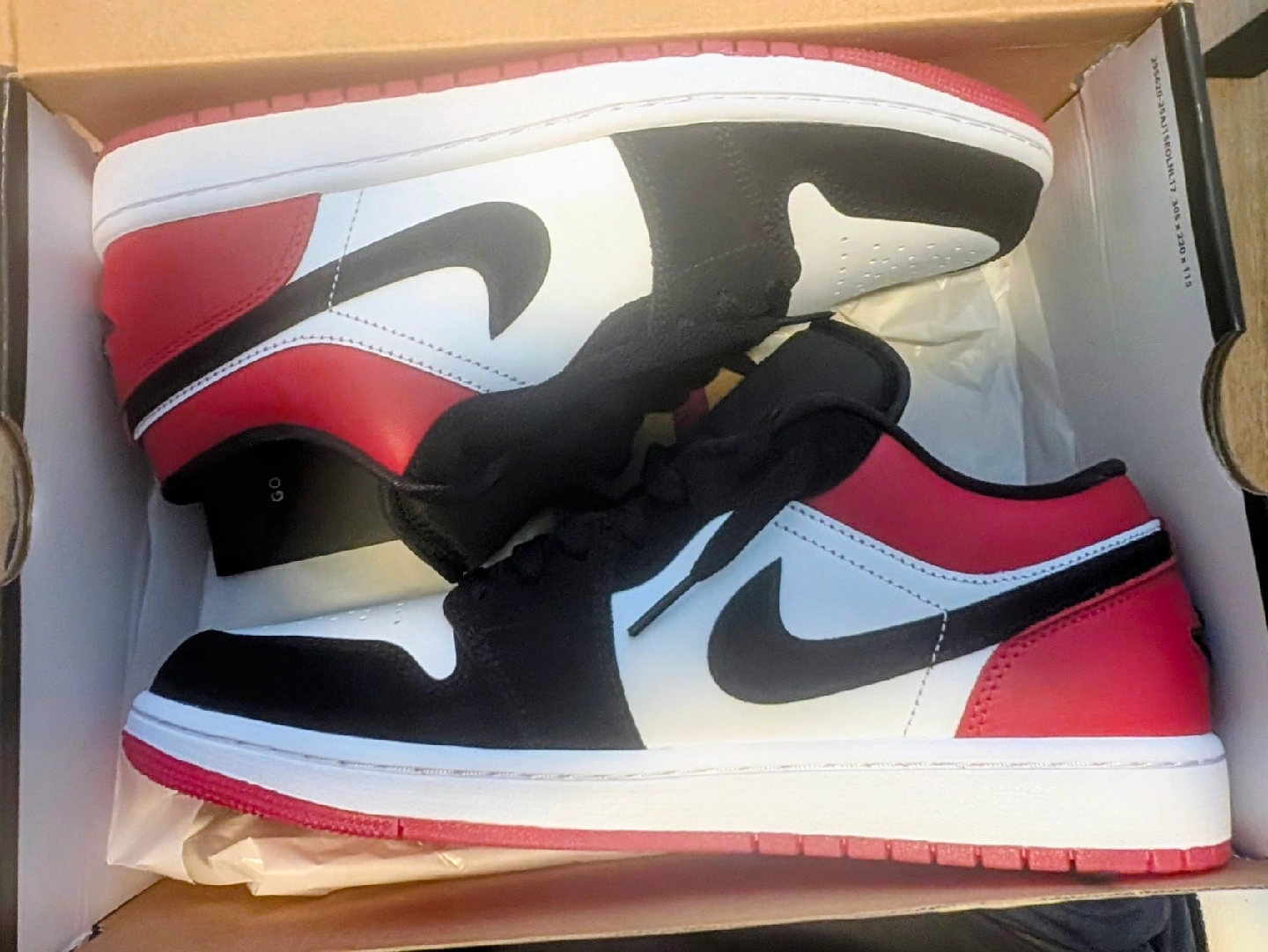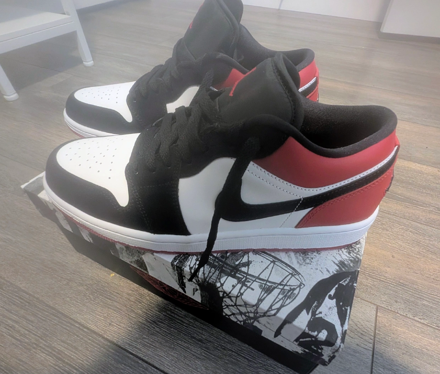Selling a new pair of Jordan 1 Low Black Toe. They come with the original box and red laces as well! Size: 9.5 US