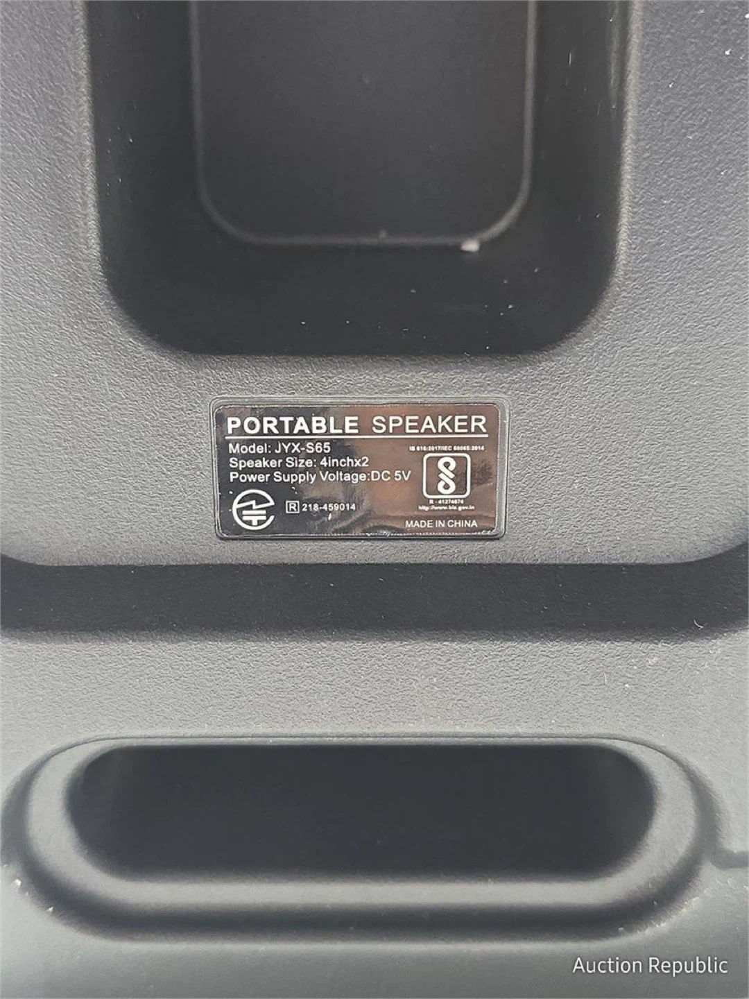 I'm selling a brand new JYX-S65 portable speaker! It comes with two microphones, a user manual, and a charging cable. The speaker is 4inchx2 in size and has a power supply voltage of DC 5V. It's still in its original box and packaging, never been used