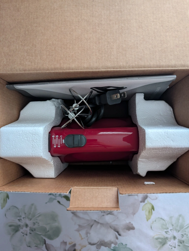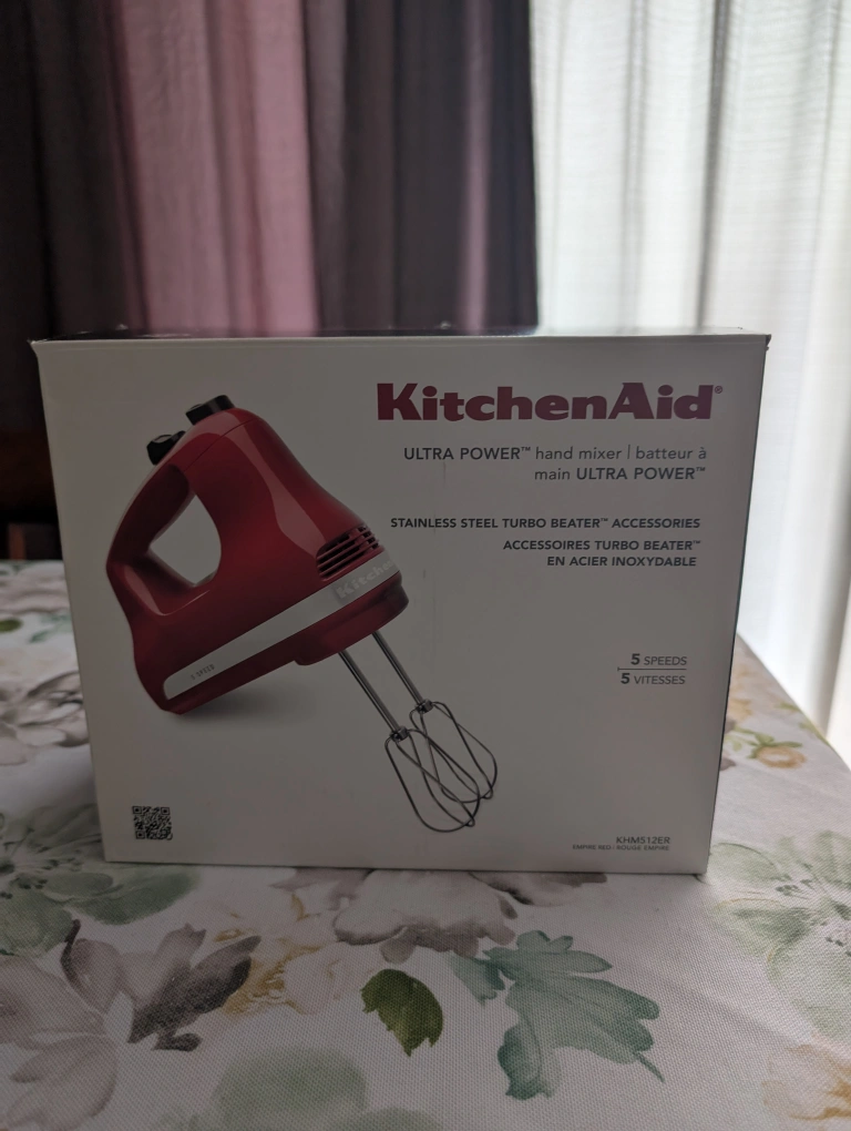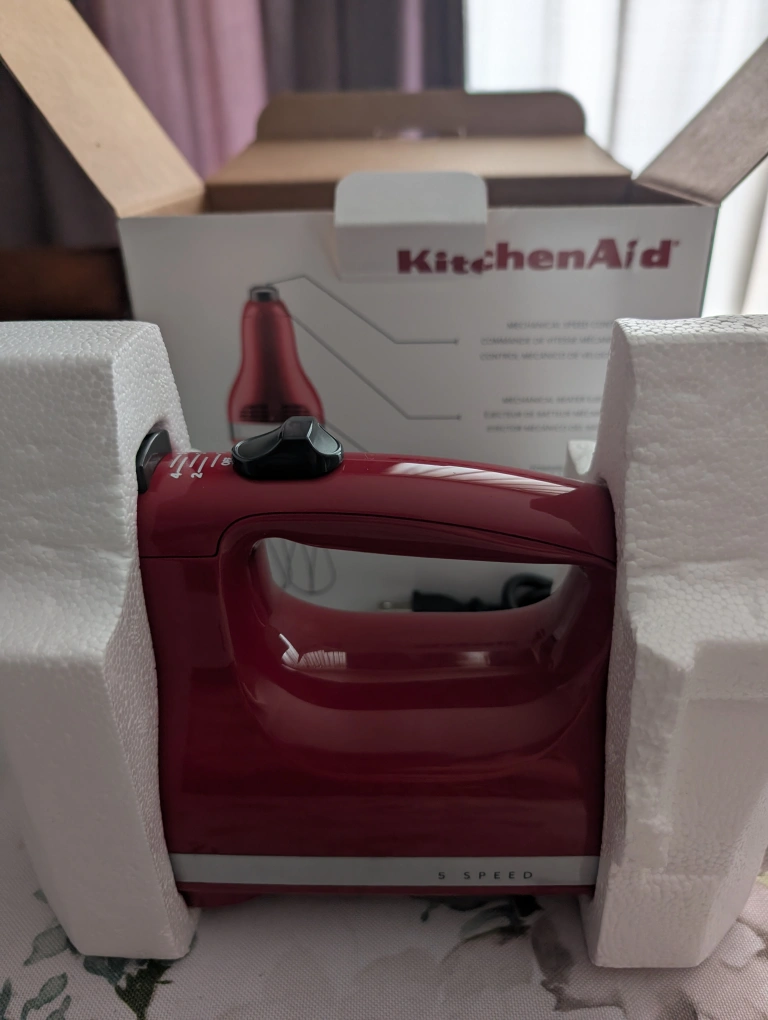"MOVING SALE" KitchenAid KHM512ER Ultra Power 5-Speed Hand Mixer in Empire Red. It has 5 speeds for mixing. It comes with two stainless steel Turbo Beater accessories that are dishwasher-safe. The motor is lightweight and powerful enough to handle tasks like mixing double batches of cookie dough. It features an easy-slide speed control, a comfort-designed handle, and a lockable swivel cord. Brand new. PICK UP ONLY.