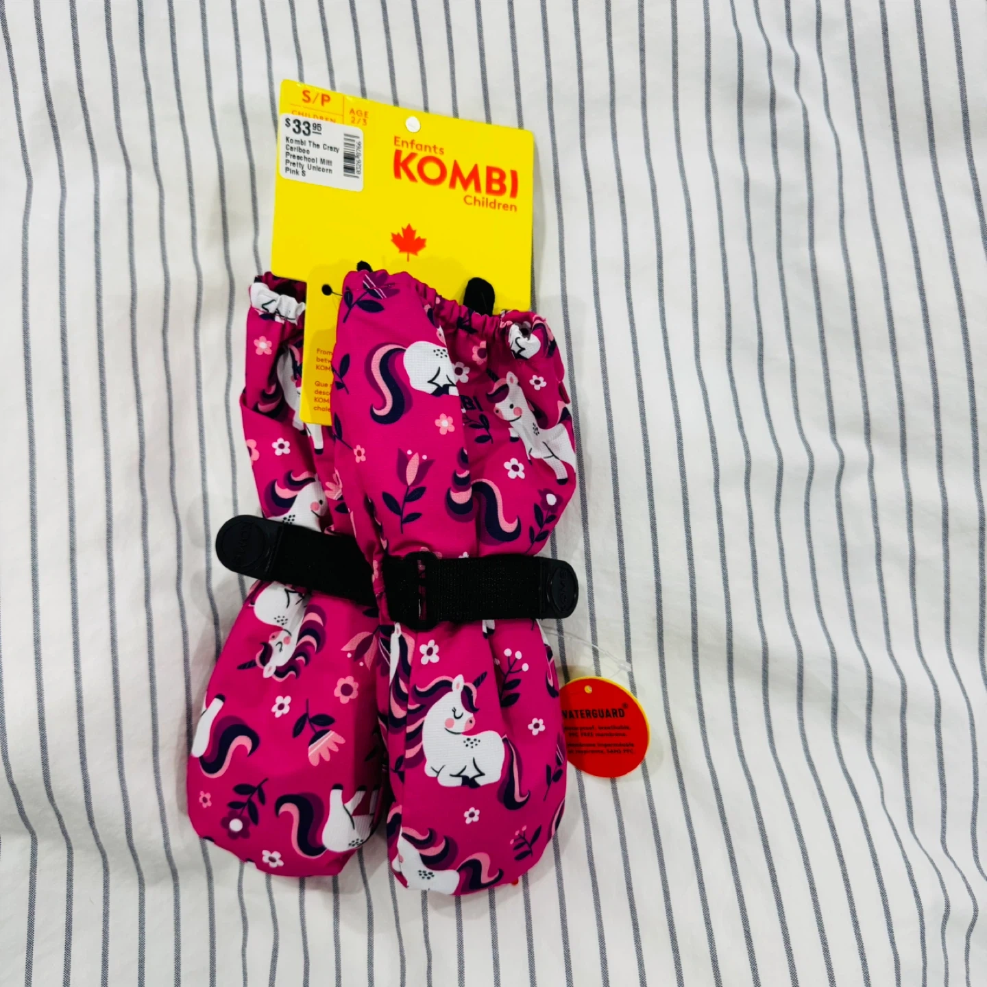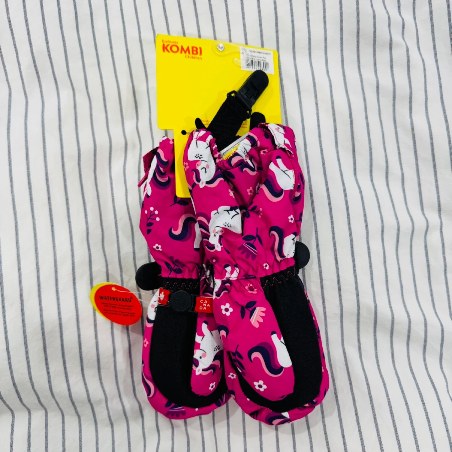 These adorable Kombi children's mittens are brand new with tags! They feature a fun unicorn and floral pattern on a pink background. They are size S/P and have a black wrist strap.