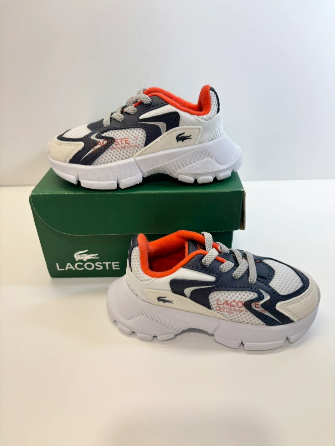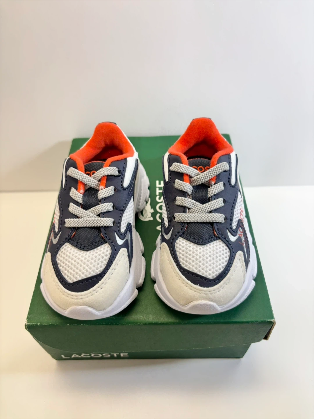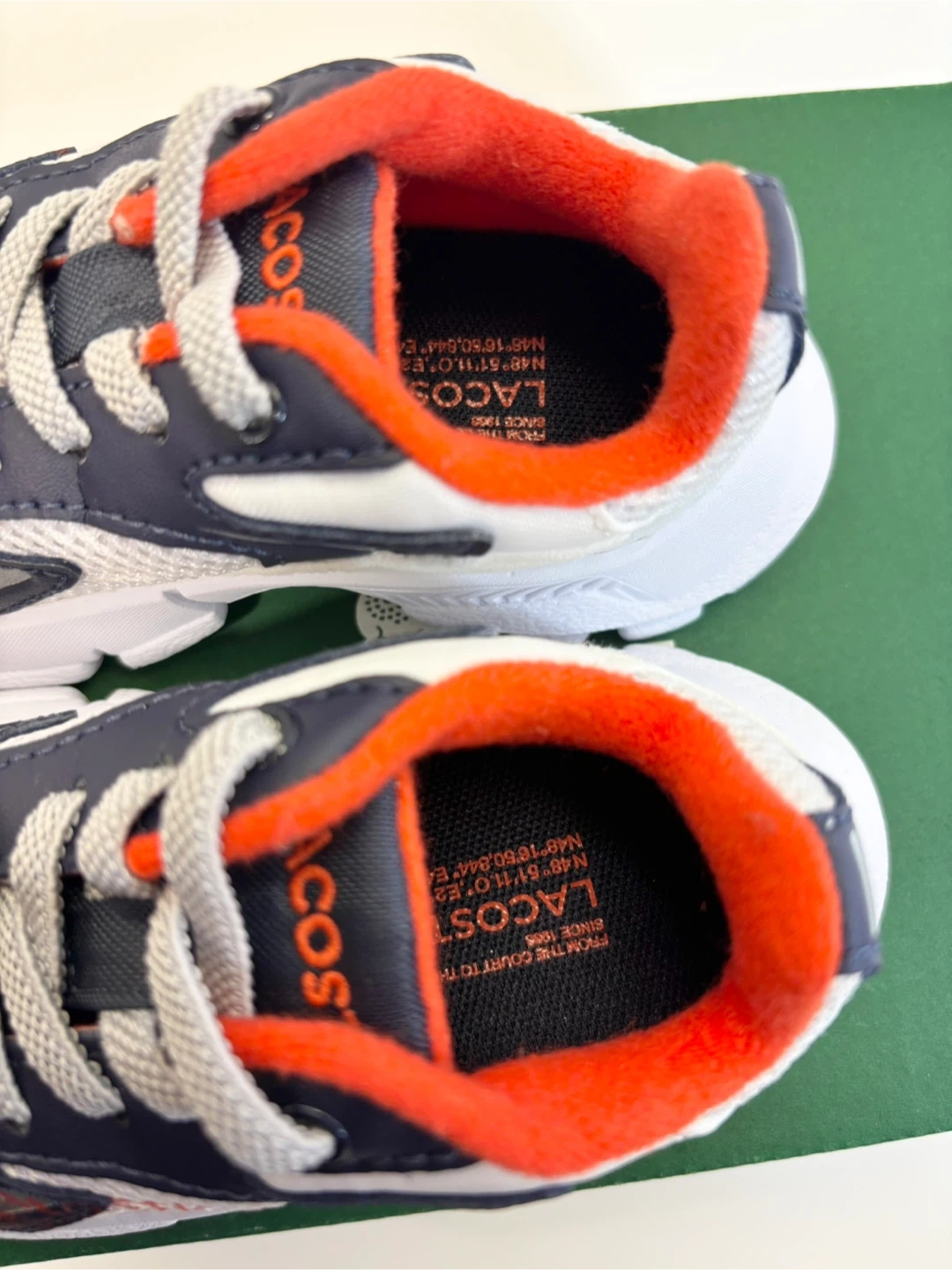 Clean and New condition , never worn and original box . Store price is $95+tax Toddler size 5 or toddler size 5c -roughly fits ages 1-2 years old Lacoste sneakers are in new condition and come with the original box! They feature a stylish design with white, navy, and orange accents. Super nice for photos or Perfect for your little one's everyday adventures!