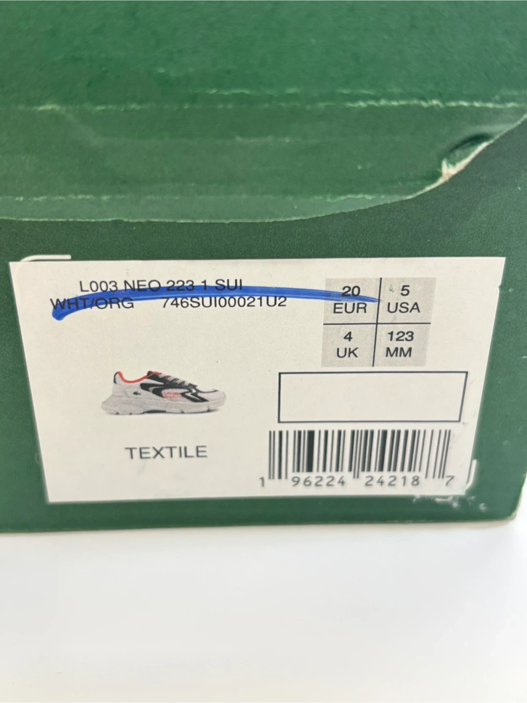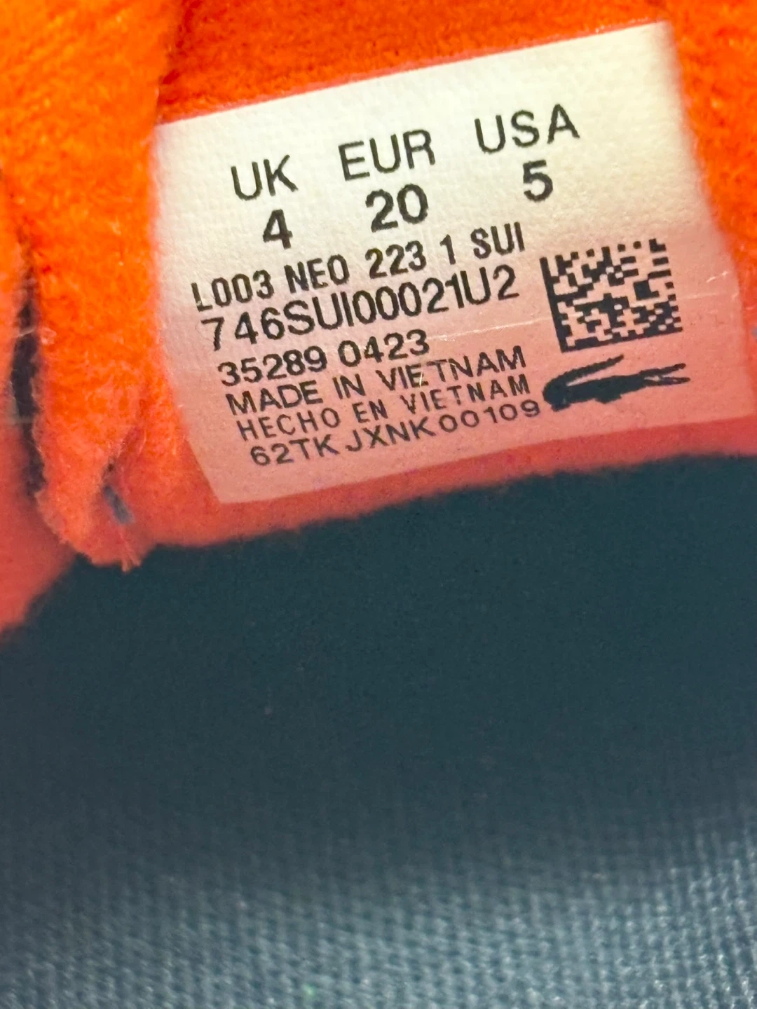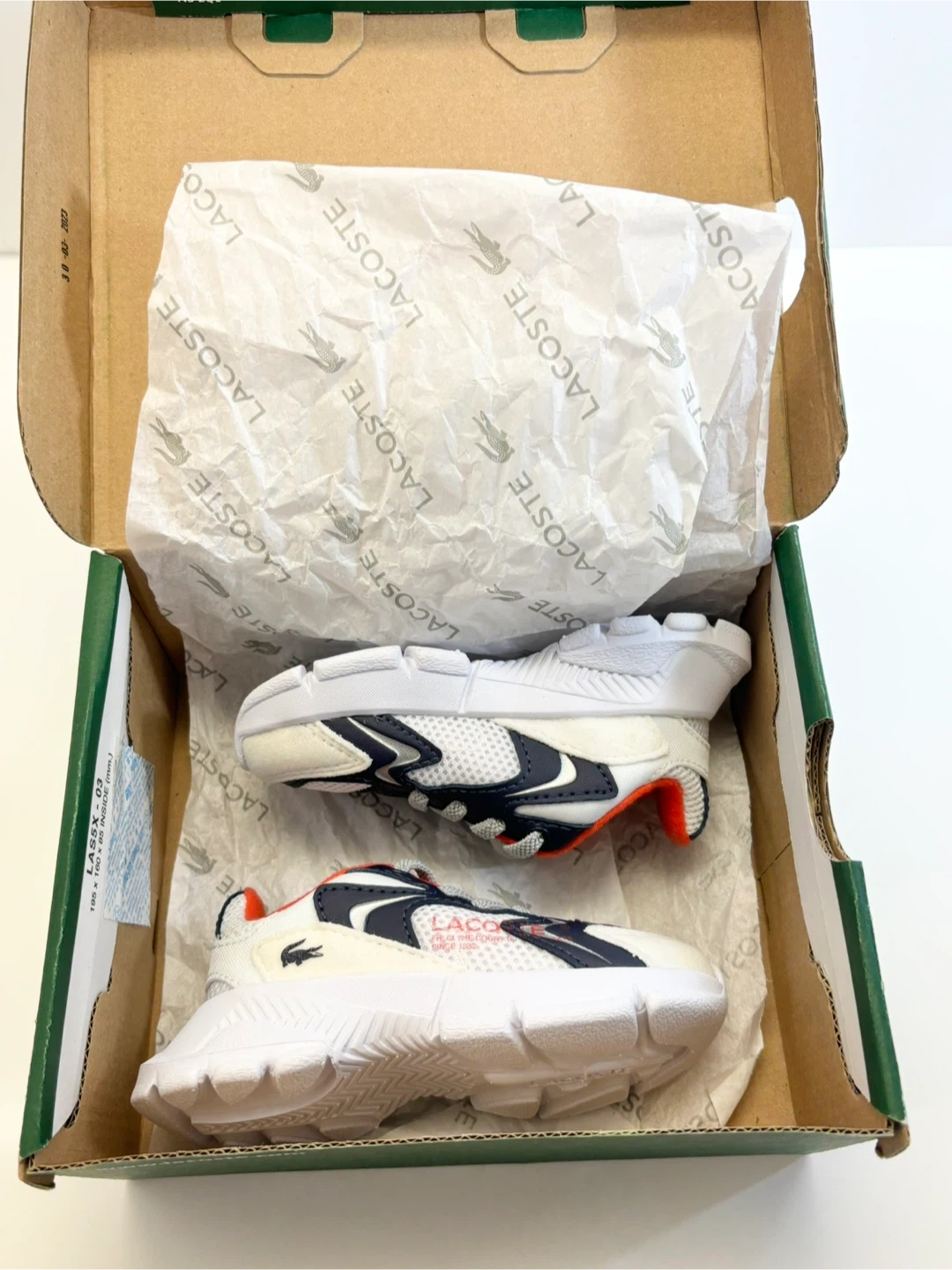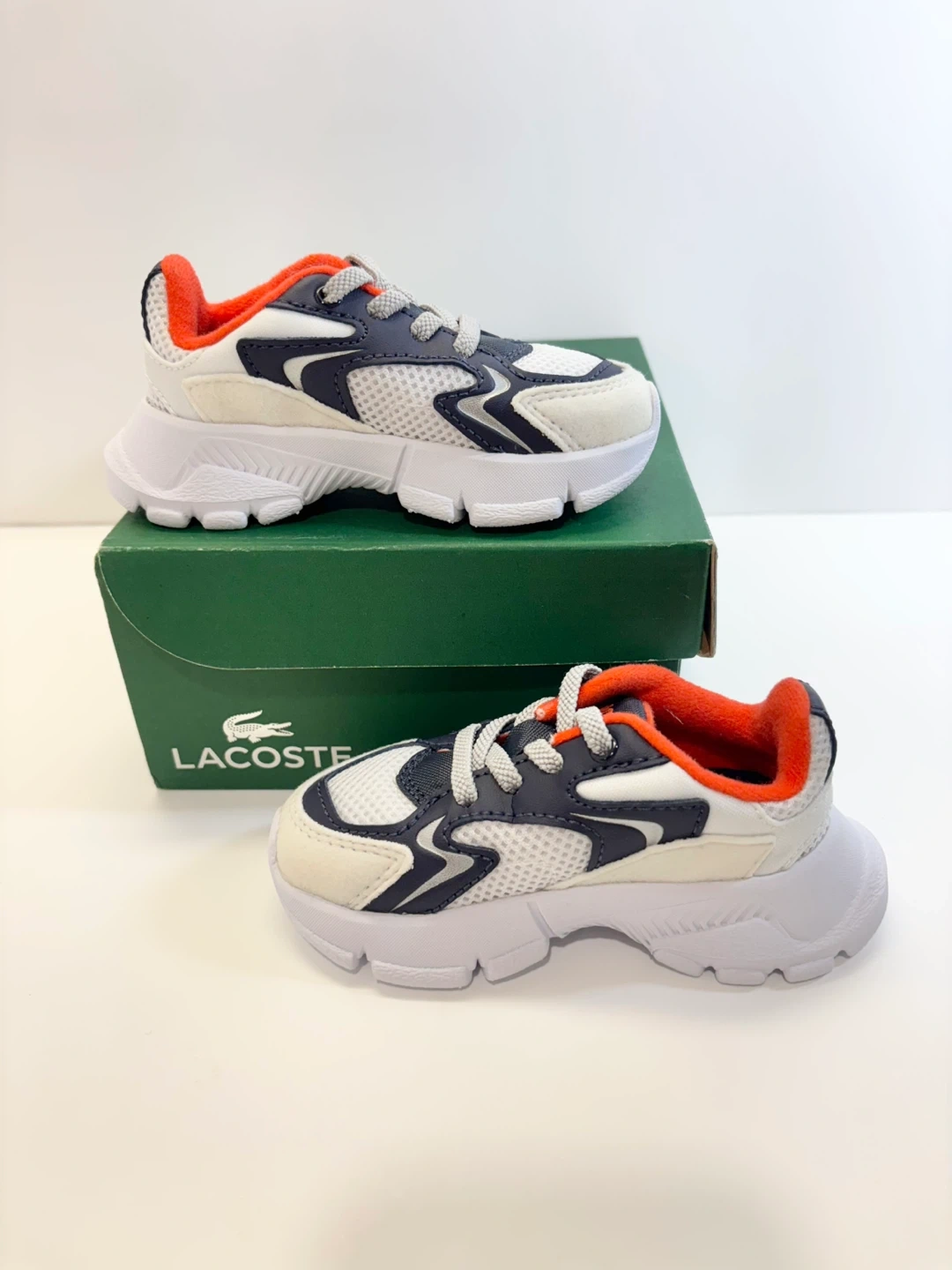 Clean and New condition , never worn and original box . Store price is $95+tax Toddler size 5 or toddler size 5c -roughly fits ages 1-2 years old Lacoste sneakers are in new condition and come with the original box! They feature a stylish design with white, navy, and orange accents. Super nice for photos or Perfect for your little one's everyday adventures!
