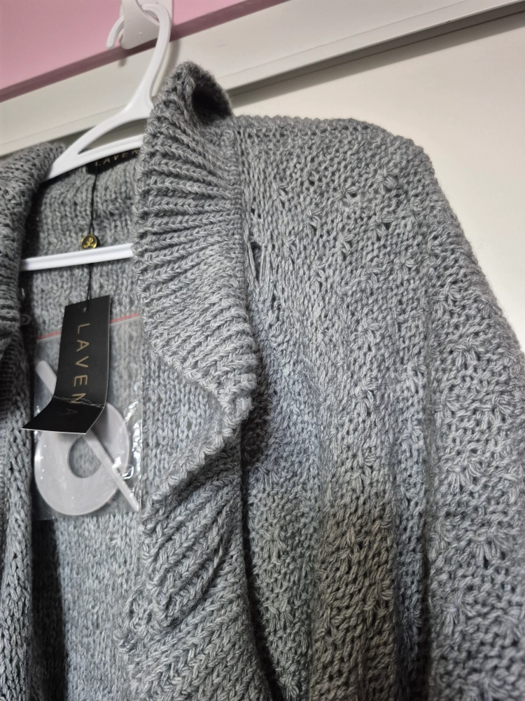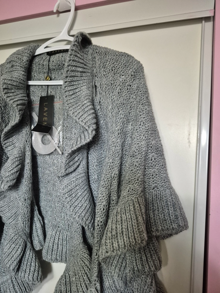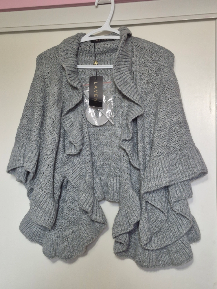 Selling a brand new Lavenia cardigan! It's a lovely grey colour and a one-size-fits-all. The cardigan has a beautiful ruffled design. It's in very good condition with tags still attached