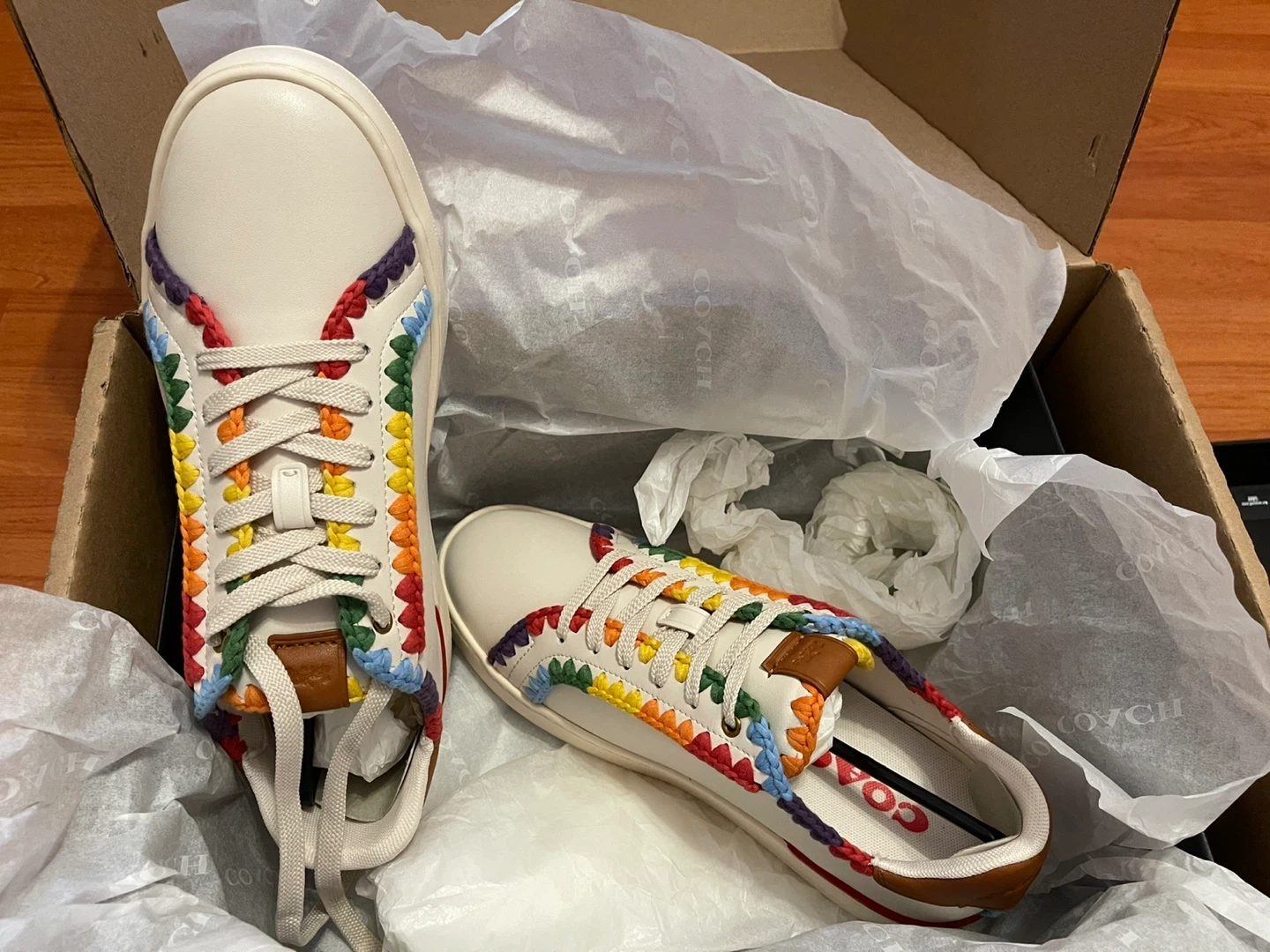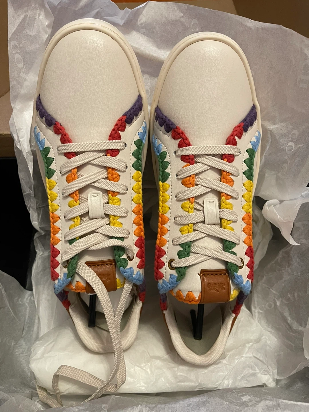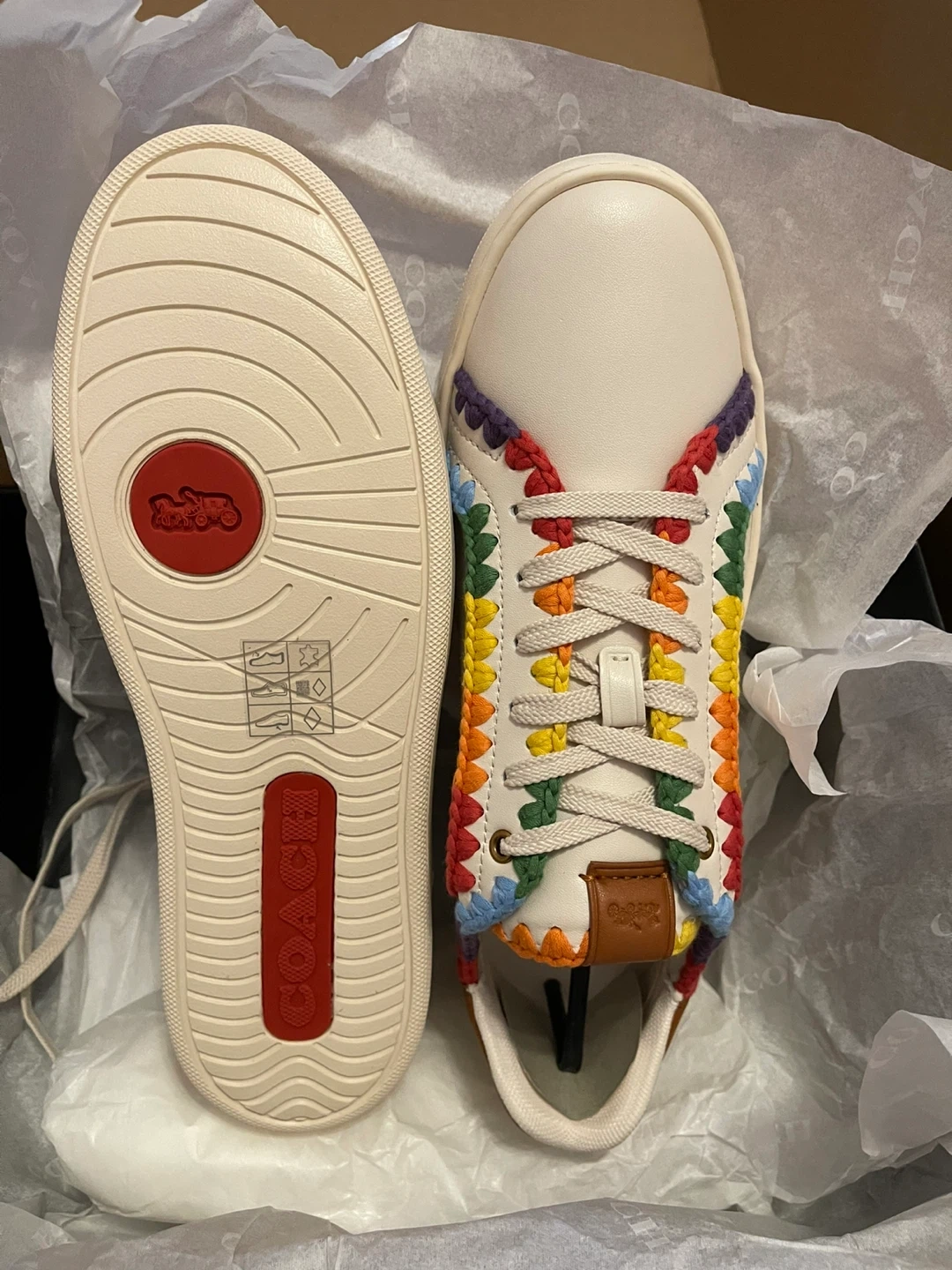 These Coach leather sneakers are brand new and have never been worn! They feature a fun rainbow crochet design. Comes with the original box.Size 9.5