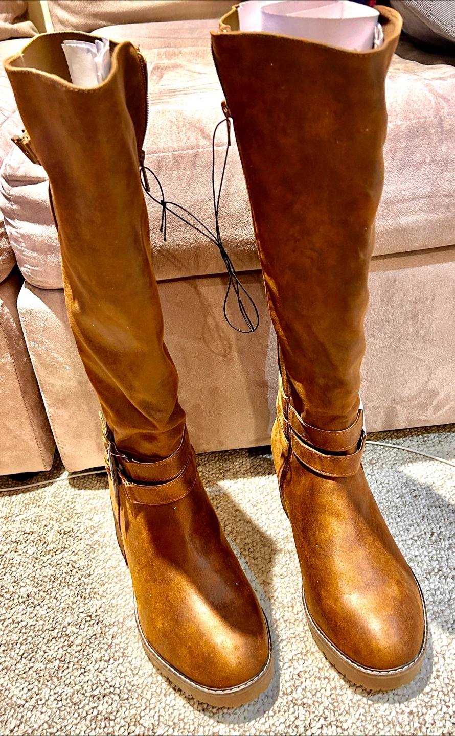 Nice new pair of long women’s brown leather boots. Stylish 3” heel. Unworn.