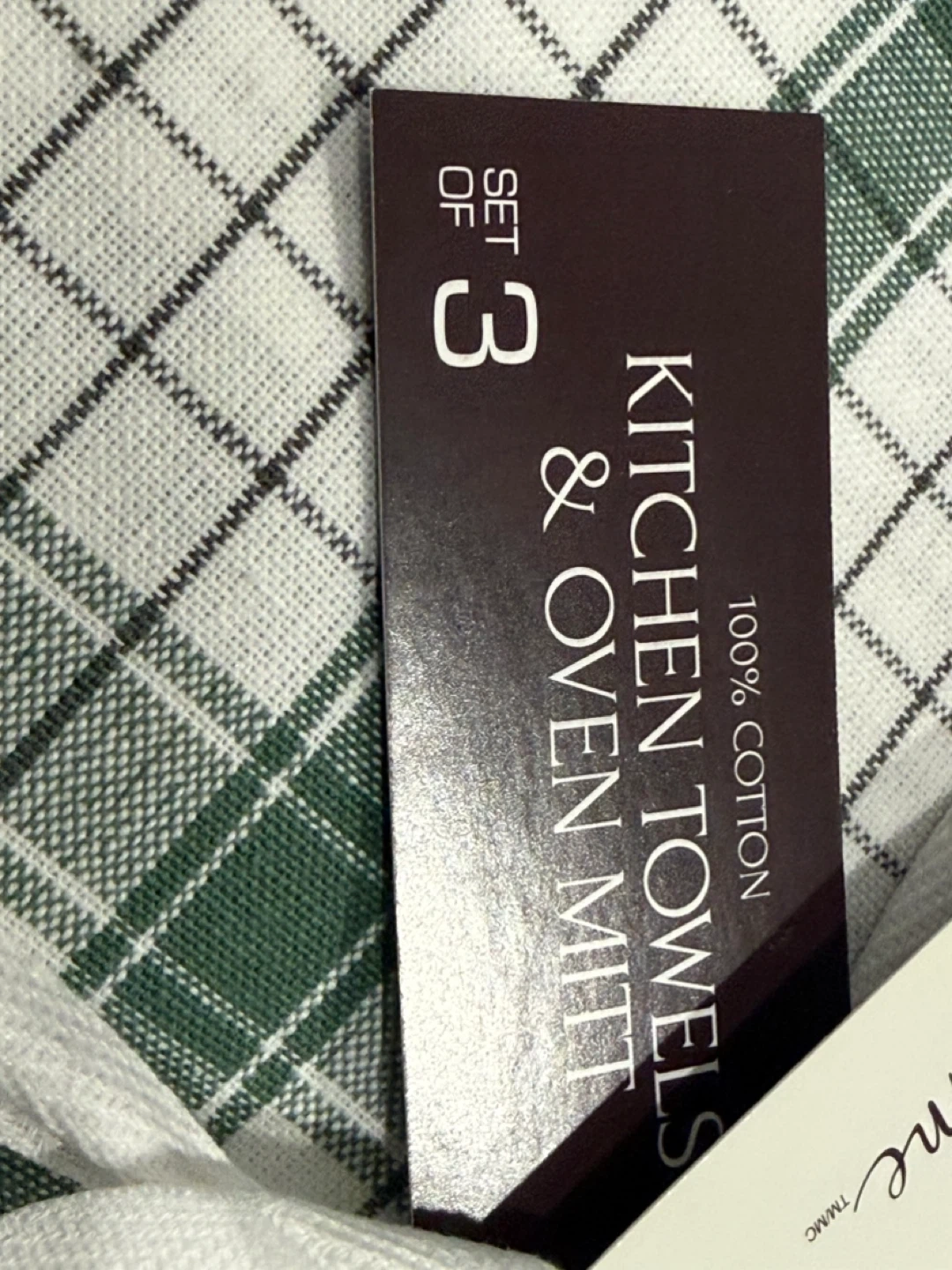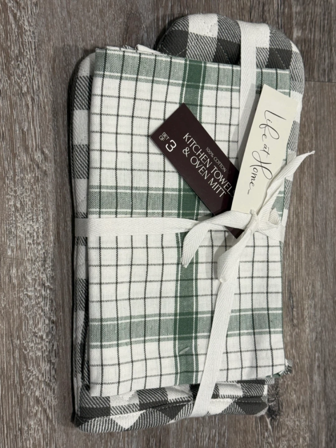 Get this set of 2 kitchen towels and an oven mitt from Life at Home! They are 100% cotton and feature a charming green and white checkered pattern, perfect for adding a touch of country charm to your kitchen Pick up Sage Hill NW Cash only Check out my other listings Pet and smoke free home