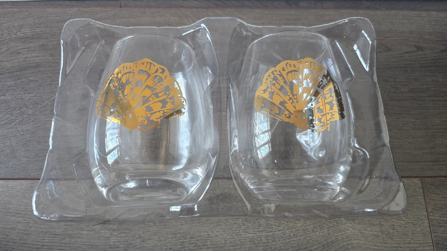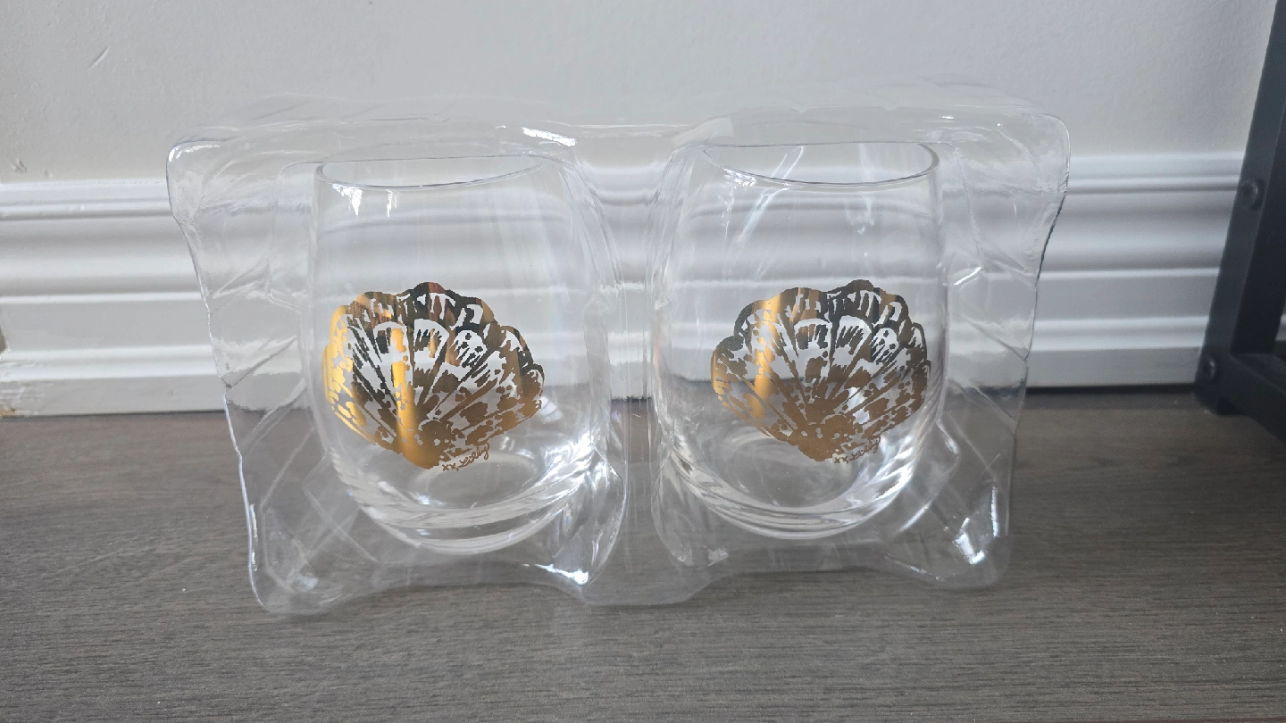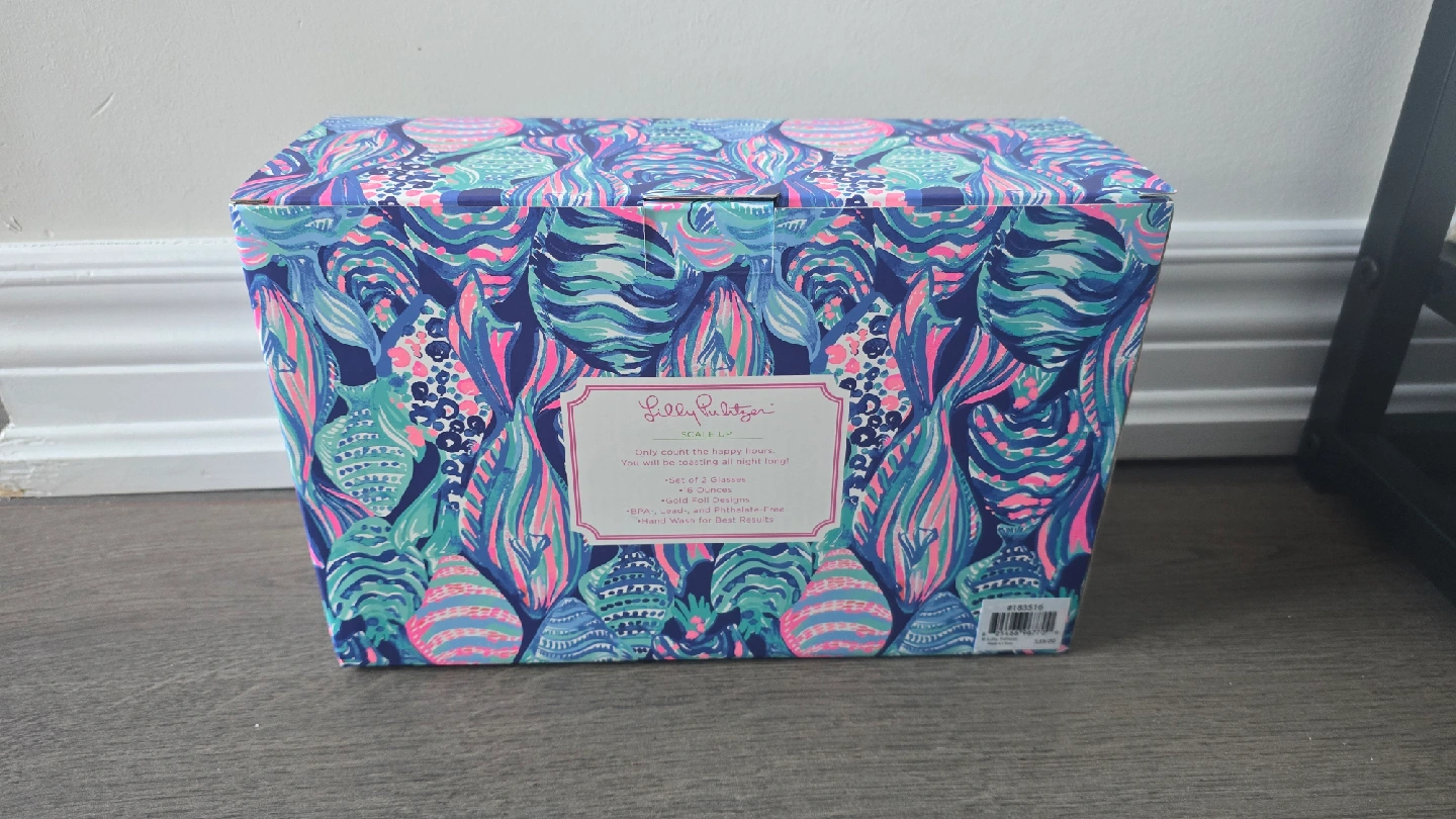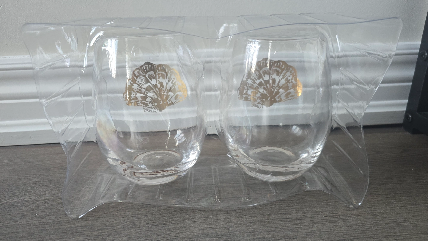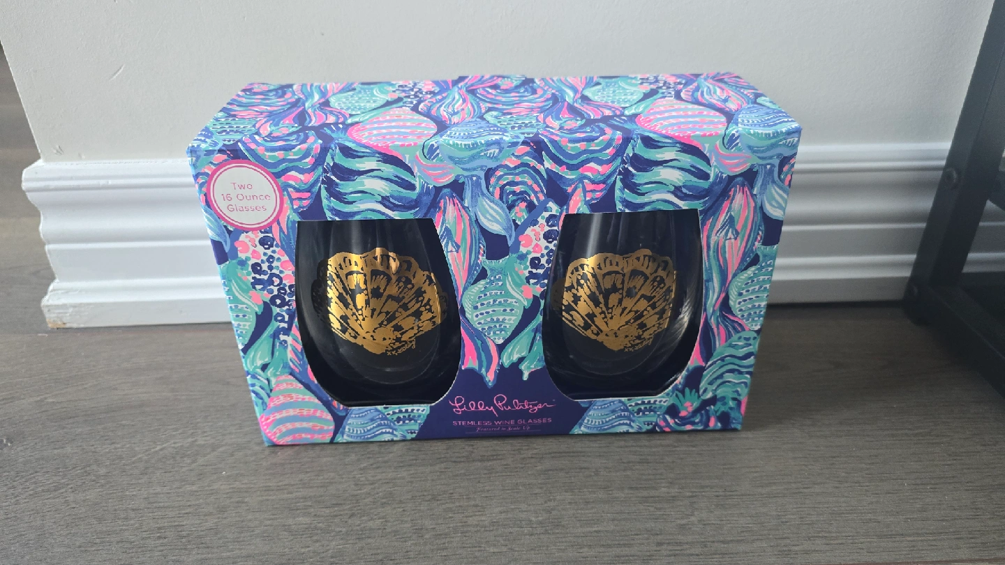 These Lilly Pulitzer stemless wine glasses are brand new and come in a set of two! They each hold 16 ounces and feature a beautiful gold shell design. They are new in box, making them perfect for gifting or adding a touch of beachy charm to your collection. Retails for $49