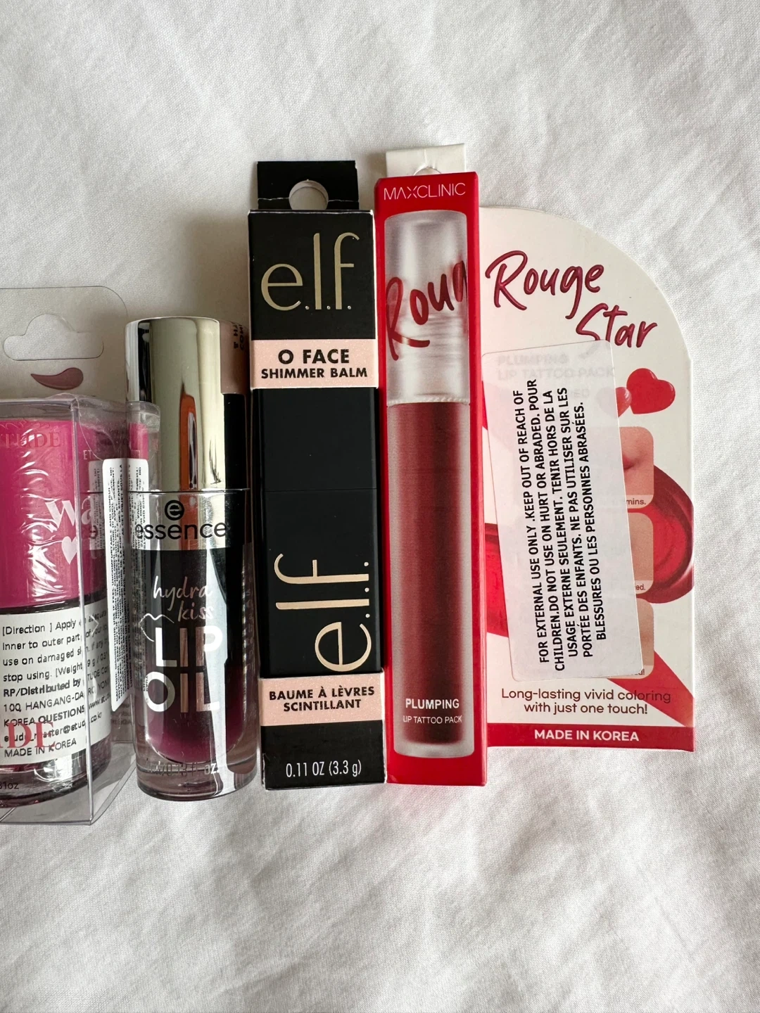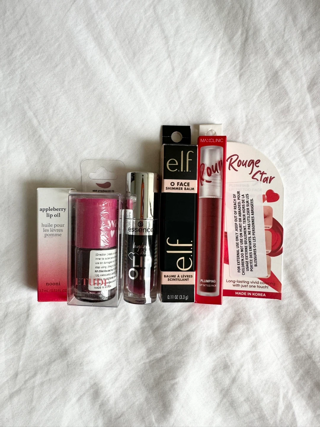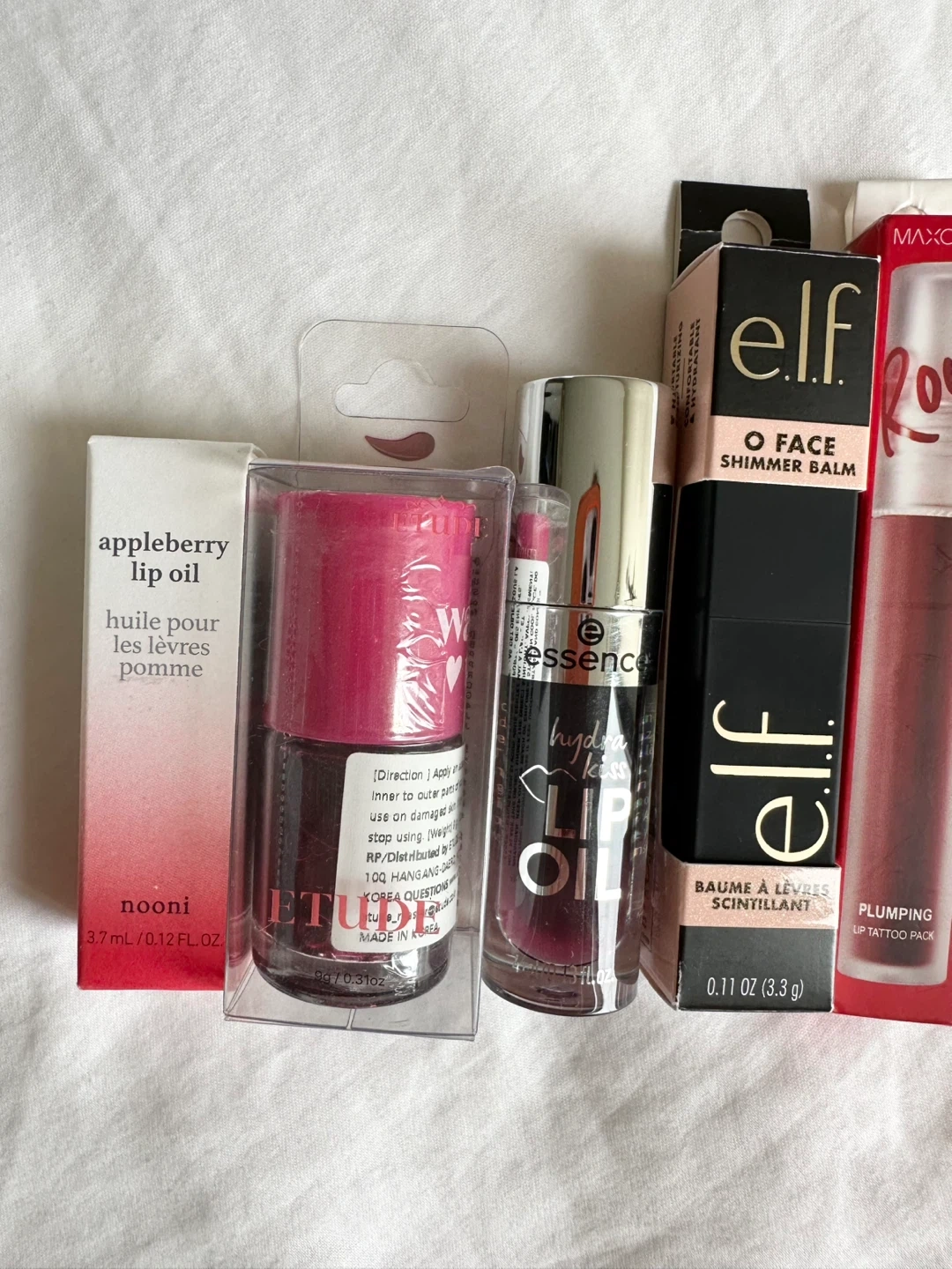 New, unused and unopened lip product bundle. Includes: - NOONI Appleberry Lip Oil, EXP 2027.11.12, 3.7ml - Etude Dear Darling Water Tint in 01 Strawberry Ade, EXP 2027.05.16, 9g - Essence Hydra Kiss Lip Oil in 05 Midnight Mystery, 4ml - e.l.f. Limited Edition O Face Shimmer Balm in Pearlfection (0.11 oz/3.3 g) - MAXCLINIC Rouge Star Plumping Lip Tattoo Pack in Richly Red, EXP 2027.03.09, 5g Pickup in Richmond, cash only.