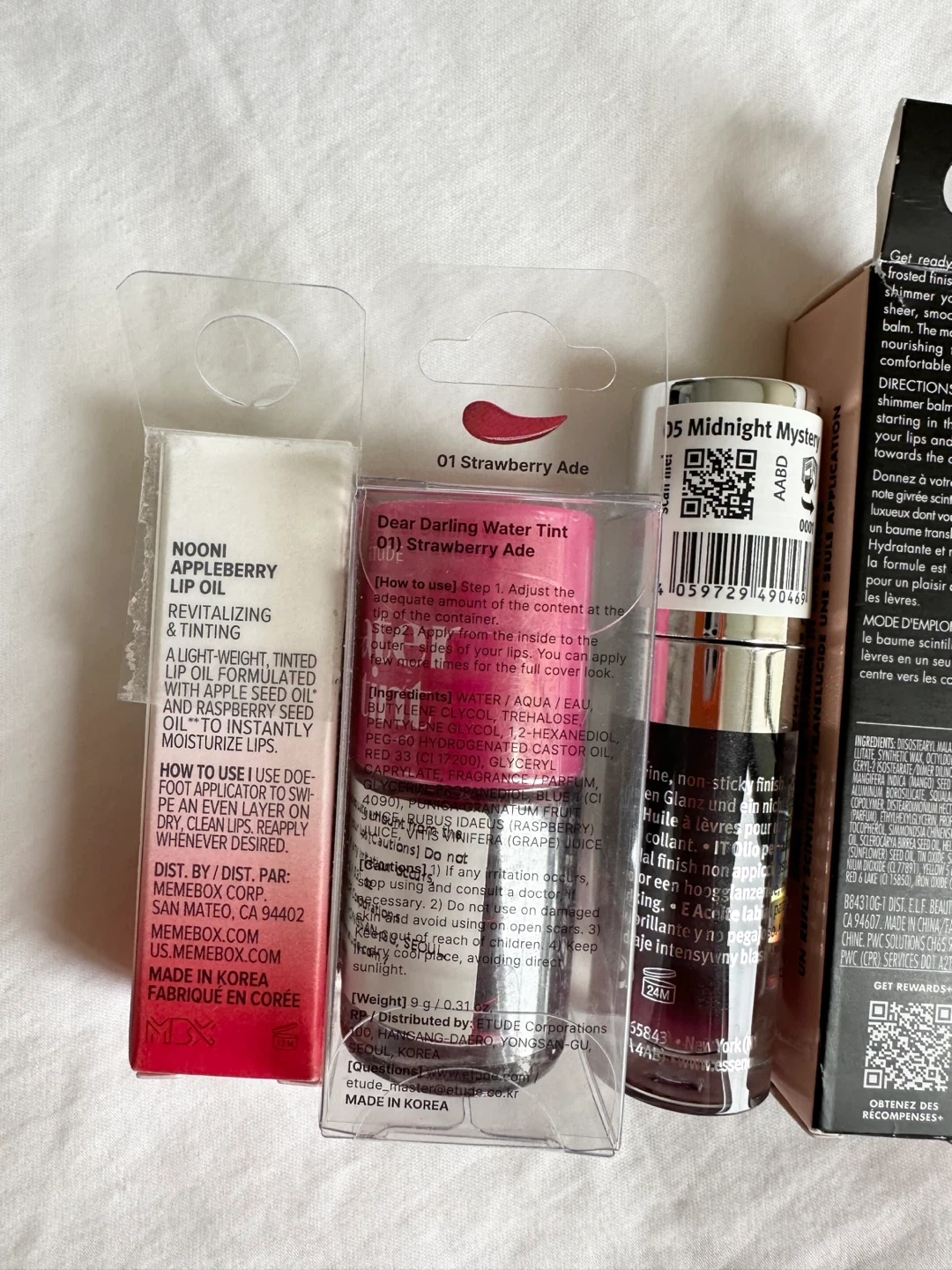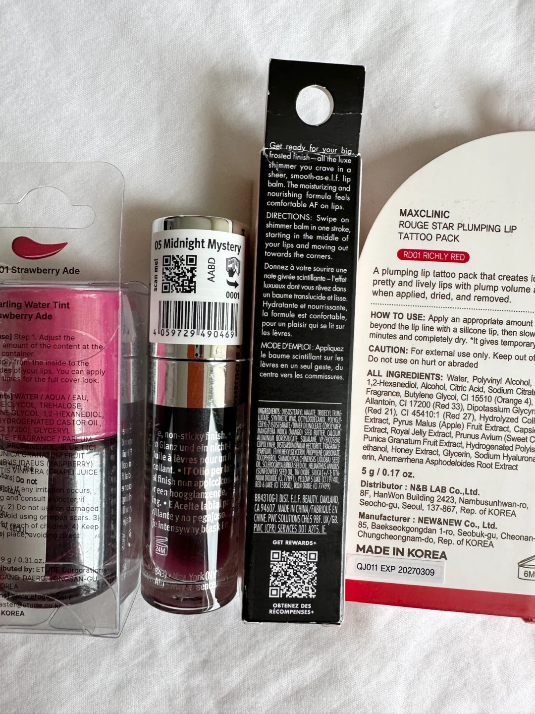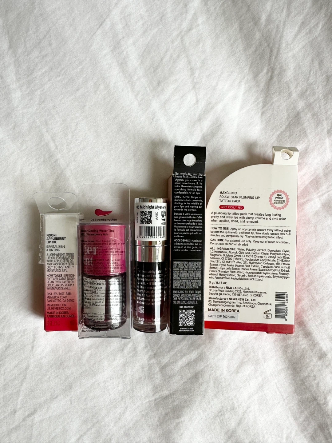 New, unused and unopened lip product bundle. Includes: - NOONI Appleberry Lip Oil, EXP 2027.11.12, 3.7ml - Etude Dear Darling Water Tint in 01 Strawberry Ade, EXP 2027.05.16, 9g - Essence Hydra Kiss Lip Oil in 05 Midnight Mystery, 4ml - e.l.f. Limited Edition O Face Shimmer Balm in Pearlfection (0.11 oz/3.3 g) - MAXCLINIC Rouge Star Plumping Lip Tattoo Pack in Richly Red, EXP 2027.03.09, 5g Pickup in Richmond, cash only.