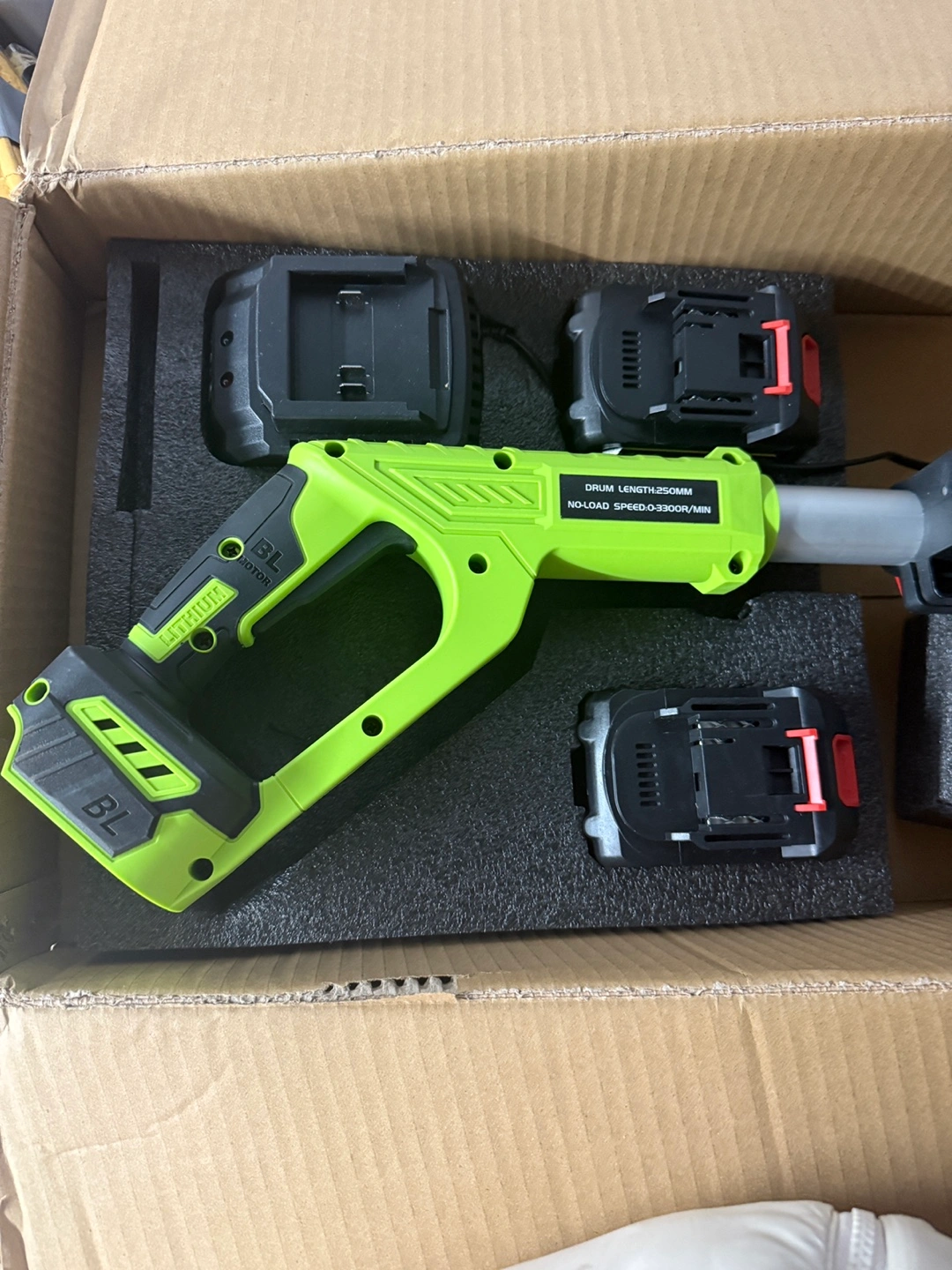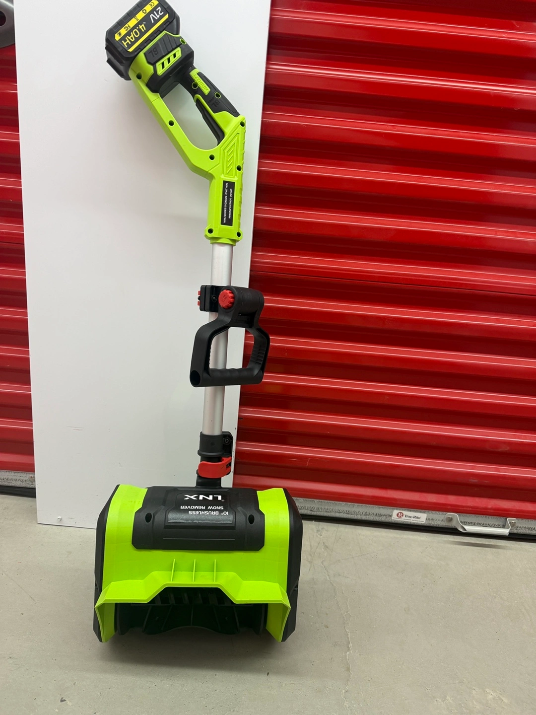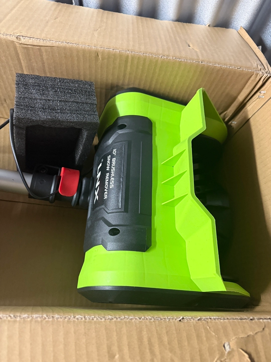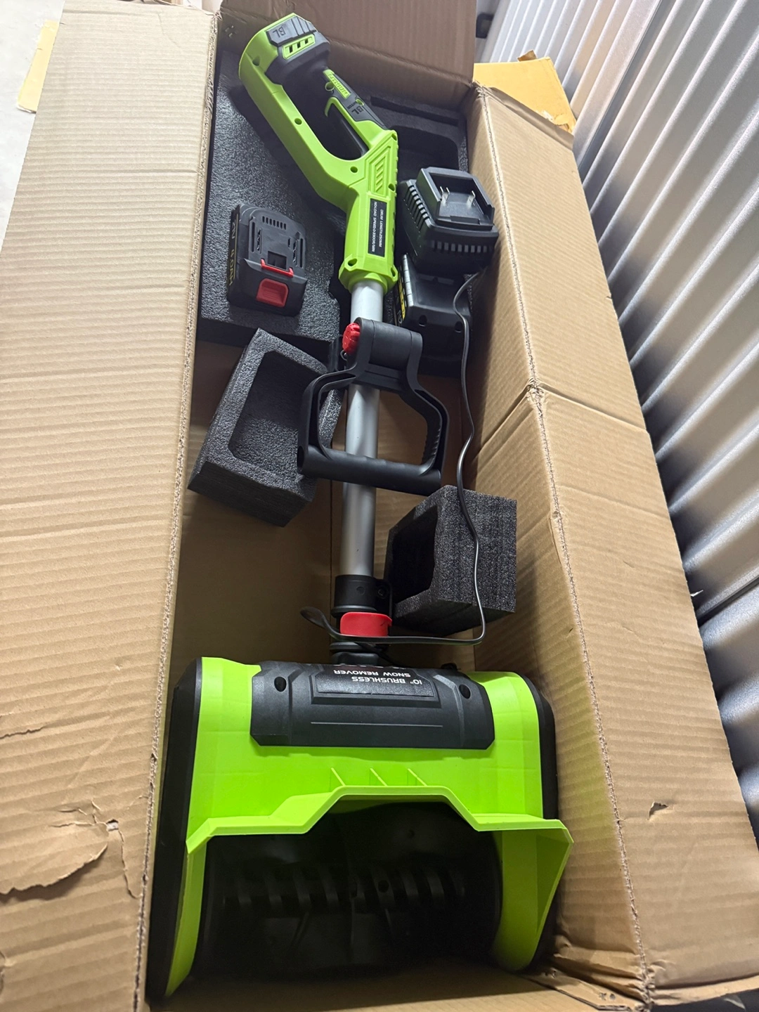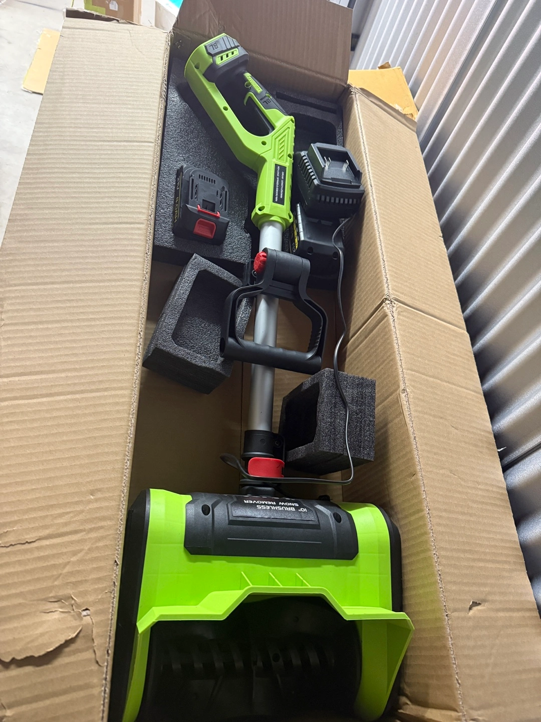 Brand new, in box. Cordless snow blower. Ten inch clearing width. Brushless motor. Includes two batteries and charger. Lime green and black.