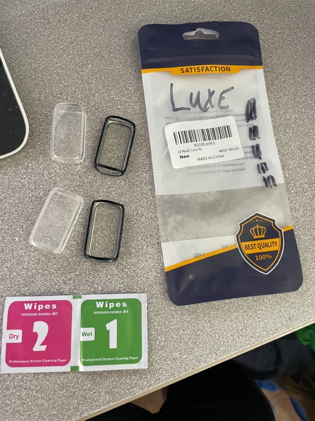 Selling a brand new 4-pack of Luxe watch covers. The package includes both clear and black cases to switch up the look of your watch. Also comes with wet and dry wipes for screen cleaning before application
