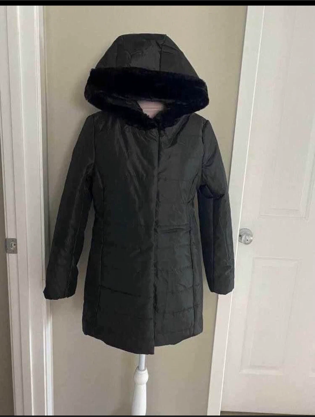 Brand New . It features a stylish faux fur trim around the hood, adding a touch of warmth and elegance. The coat is perfect for staying cozy during the colder months. It's a great addition to your winter wardrobe! Tagged as LG fits like Medium
