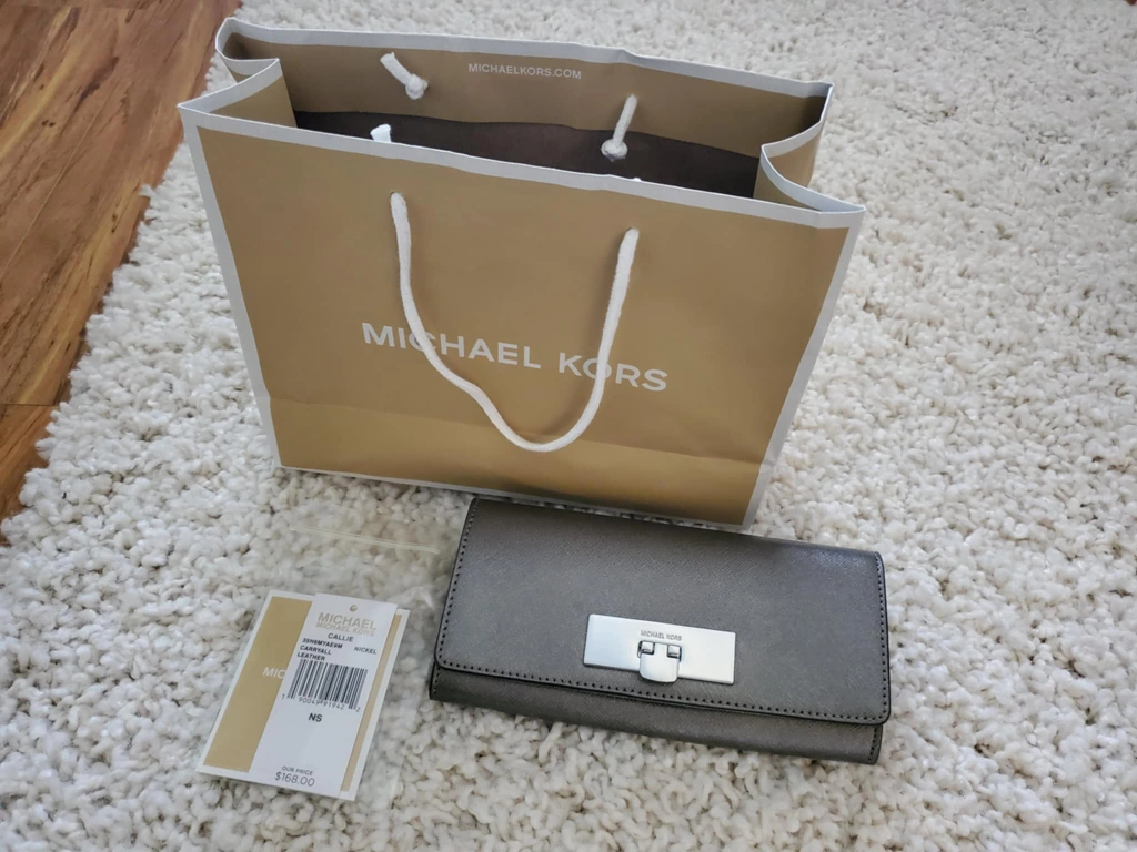 Gorgeous Michael Kors Callie carryall wallet. Nickel colour leather. Multiple card slots and zippered coin pouch. Includes original tags and Michael Kors shopping bag.