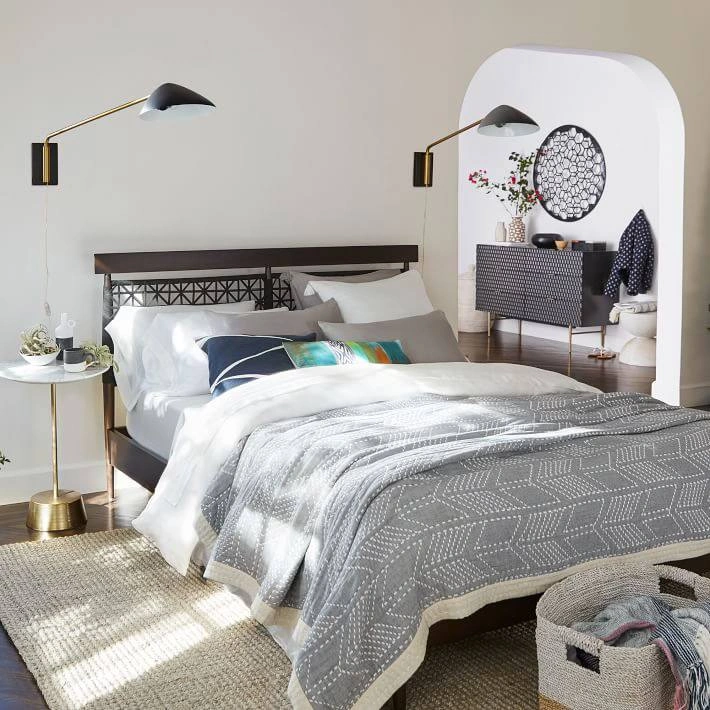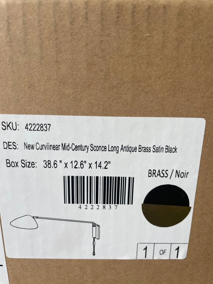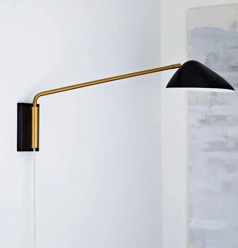 Left over from a client's project. Brand new in box 2 PLUG IN sconces from West Elm (now unavailable). Its arm and shade are adjustable so you can direct the light right where you need it. Dimensions in photo. $385 each Pick up only please - Metal body and shade in a Black finish. - Metal accents in a Brass finish. Plug-in with E26 socket. -Conforms to UL standards. Inline On/Off switch. -Accommodates one 60W incandescent bulb or LED equivalent (included). -Compatible with dimmer switches (sold separately). -This contract-grade item is manufactured to meet the demands of commercial use in addition to residential.