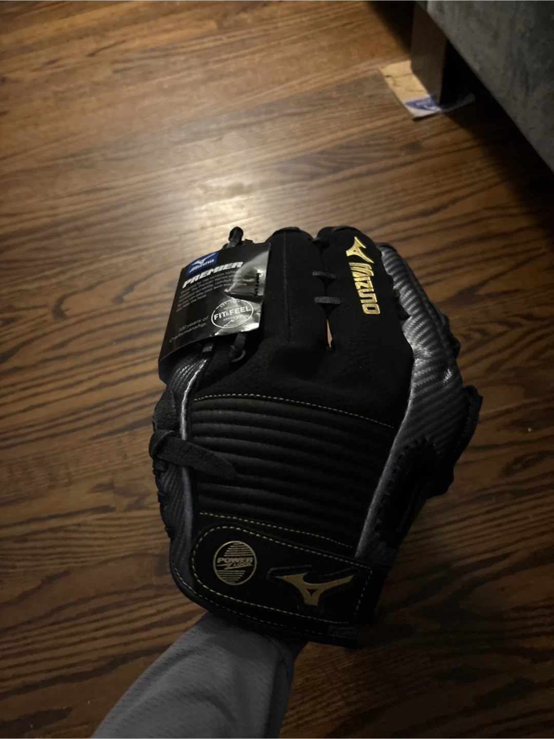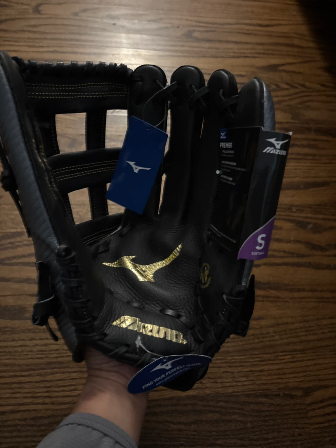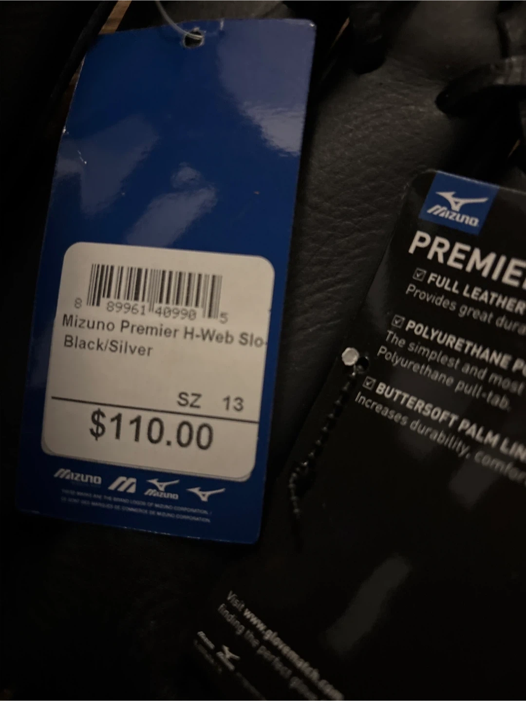 Selling a brand new with tags Mizuno Premier H-Web softball glove. It's black and silver and a size 13 inch. Retails for $110 Fits snug on smaller female hand and has room for adjustment with wrist strap