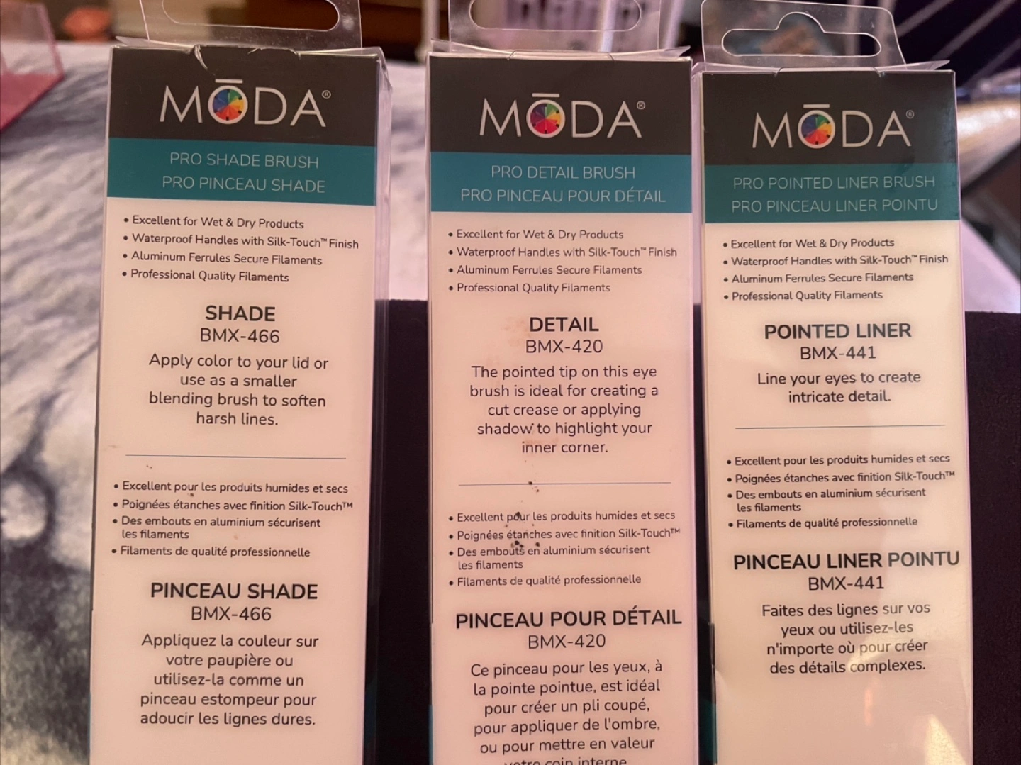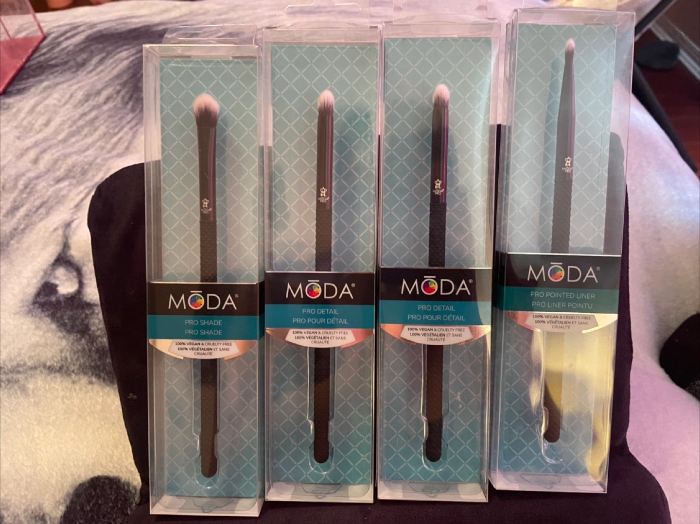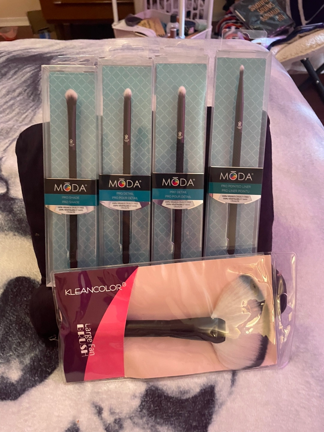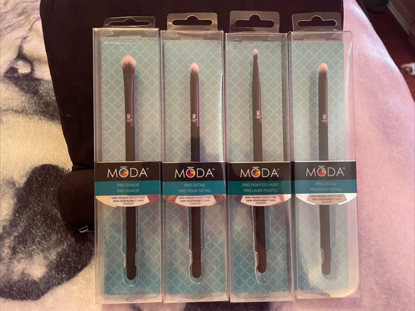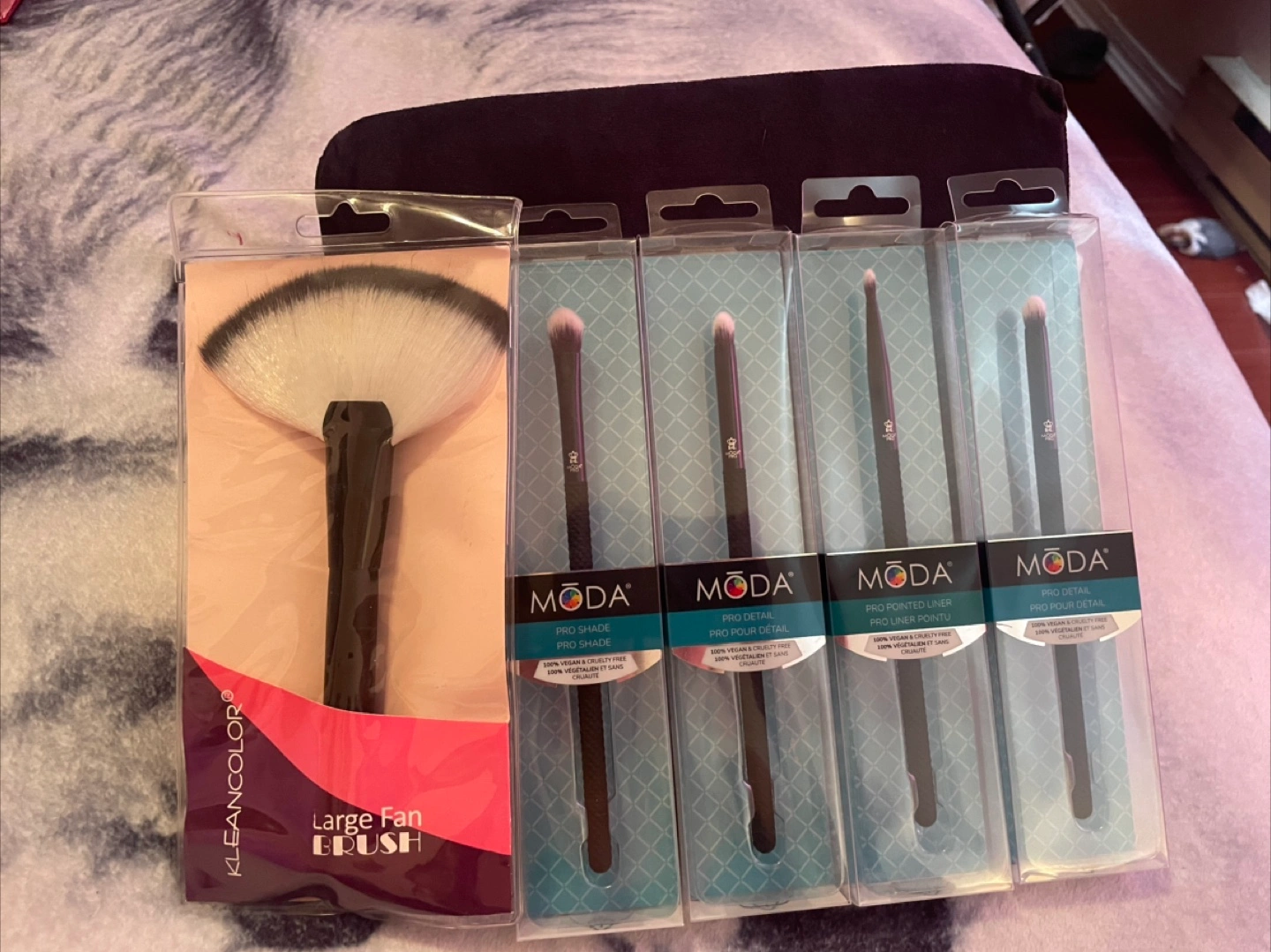 I have a brand new set of makeup brushes for sale! This includes: - Moda Pro Shade Brush (BMX-466) - Moda Pro Detail Brush (BMX-420) - Moda Pro Pointed Liner Brush (BMX-441) - Kleancolor Large Fan Brush