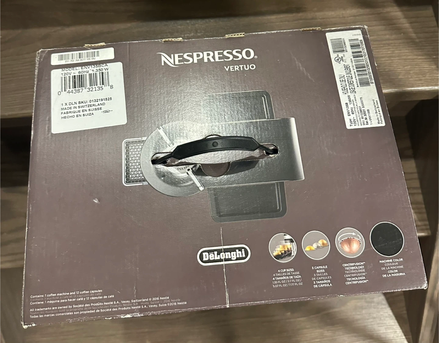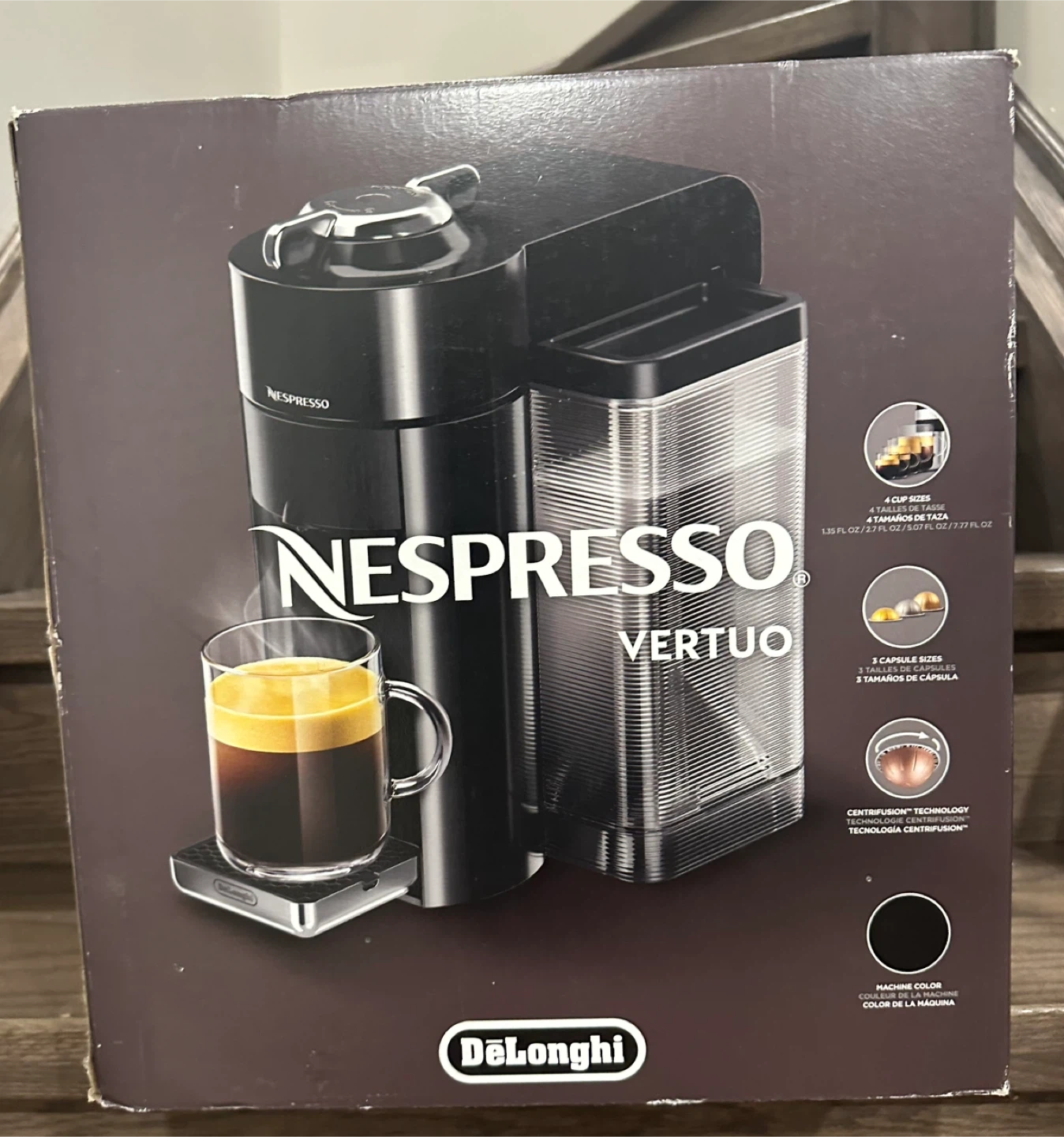 Selling a brand NEW never opened Nespresso Vertuo coffee machine made by DeLonghi! It uses centrifusion technology and makes 4 cup sizes. It can make espressos and coffee. It uses 3 capsule sizes.