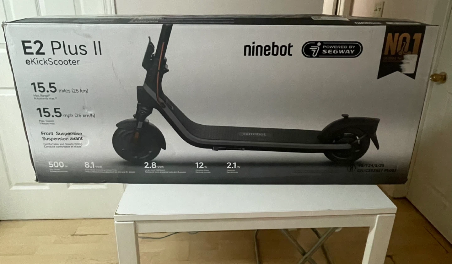 Selling a brand new Ninebot E2 Plus II eKickScooter! It's still in its original box and packaging. Key features include: - Max range of 15.5 miles (25 km) - Max speed of 15.5 mph (25 km/h) - Front suspension for a comfortable ride Perfect for getting around town!
