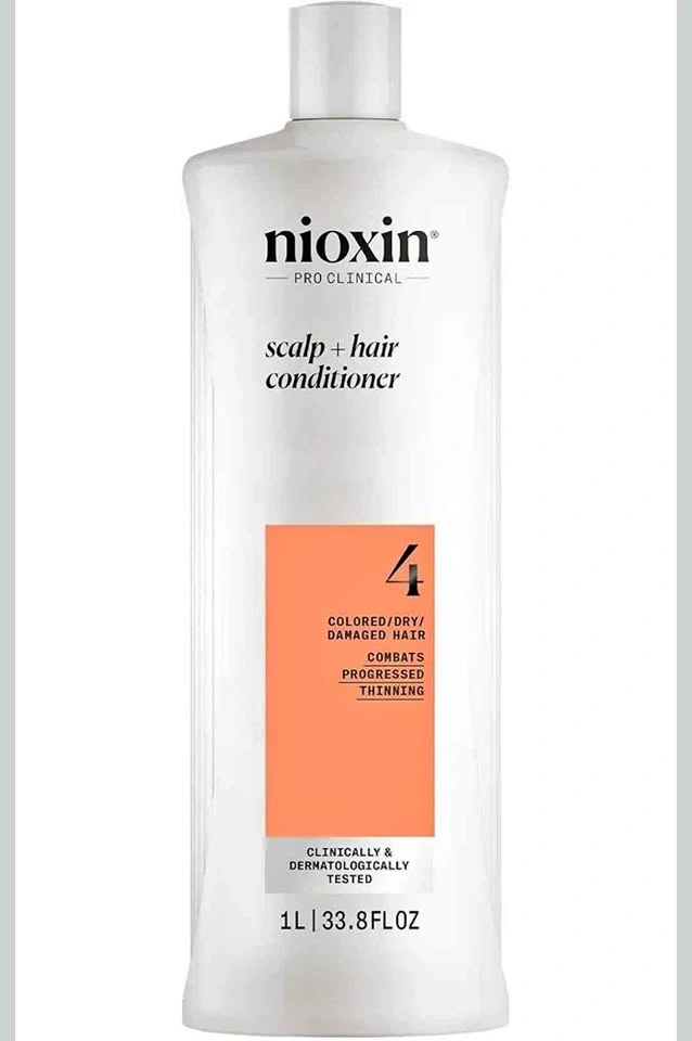 Brand New 1Litre/33.8 FL OZ Nioxin System 4 Scalp + Hair Thickening Conditioner for Colored, Dry, & Damaged Hair with Progressed Thinning | Maintain Vibrant Color | Nourish & Boost Hair Density with Niacinamide & Biotin | Restore Moisture & Resilience – Promotes Vitality PROFESSIONAL HAIR AND SCALP CLEANSER SHAMPOO for color treated hair with progressed thinning Award: Behind the Chair Stylist Choice Winner Favorite Thinning Haircare, 16 consecutive years MOISTURIZES AND CLEANSES DRY SCALP and chemically treated hair for thicker, fuller looking hair PREPARE HAIR AND SCALP for a complete hair treatment with Nioxin's three part System 3 Cleanser for Color Treated Hair with Light Thinning.