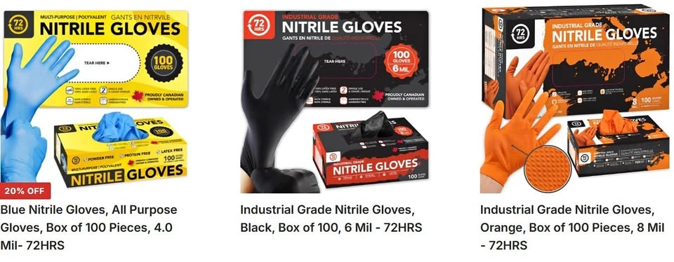 Boxes are slightly damaged but gloves are new and unused. Message with how many of which SKU (FAS-###) you'd like, and in what size. Large selection. Touch screen compatible. 100 gloves per box unless otherwise stated. Discounts negotiable if buying in bulk. Regularly updated inventory is as follows: $4 per box [4 Mil] [Blue] [FAS-165]: Small - 7 boxes Medium - 44 boxes Large - 18 boxes XL - 22 boxes Regular price: $7.99 https://72hours.ca/products/blue-nitrile-gloves-100pcs-4mil-72hrs ____________________ $5 per box [5 Mil] [Blue] [FAS-136]: Small - 11 boxes Medium - 1 boxes Large - SOLD OUT XL - 1 boxes Regular price: $10.99 https://72hours.ca/products/black-nitrile-gloves-medical-gloves-100-pcs-5-mil-ready-first-aid ____________________ $6 per box [200 GLOVES PER BOX] [4 Mil] [Blue] [FAS-175]: Small - 34 boxes Medium - 28 boxes Large - 35 boxes XL - 80 boxes Regular price: $14.99 https://72hours.ca/products/blue-nitrile-gloves-200pcs-4mil-72hrs [6 Mil] [Black] [TEXTURED TIPS] [FAS-179]: Small - 1 boxes Medium - 5 boxes Large - SOLD OUT XL - SOLD OUT Regular price: $12.99 https://72hours.ca/products/black-industrial-nitrile-gloves-100pcs-6mil-72hrs ____________________ $9 per box [8 Mil] [Orange] [TEXTURED TIPS & PALMS] [FAS-183]: Small - SOLD OUT Medium - SOLD OUT Large - 26 boxes XL - SOLD OUT Regular price: $18.99 https://72hours.ca/products/orange-industrial-nitrile-gloves-100pcs-8mil-72hrs [8 Mil] [Black] [TEXTURED TIPS & PALMS] [FAS-191-194]: Small - 1 boxes Medium - 7 boxes Large - 3 boxes XL - SOLD OUT Regular price: $18.99 https://72hours.ca/products/black-industrial-grade-nitrile-gloves-100pcs-8mil-72hrs Sold out items may come back in stock in the future.