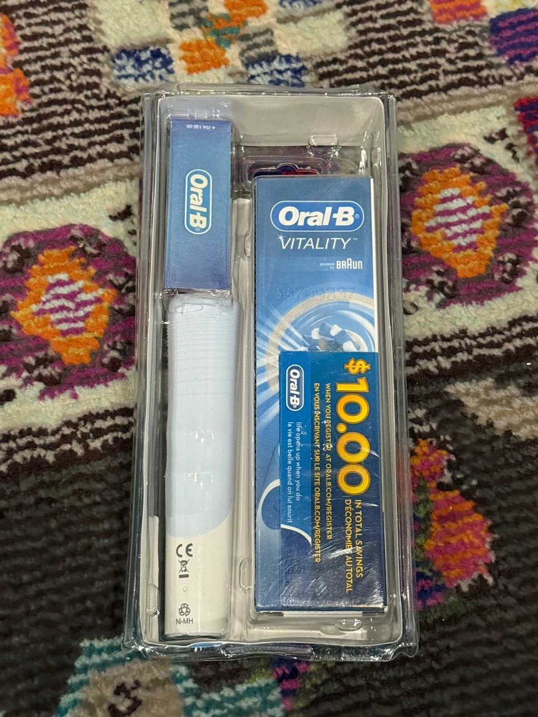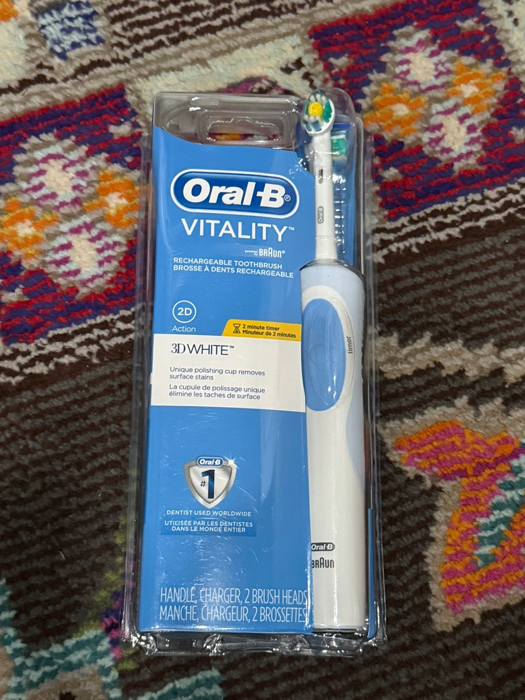 I'm selling a brand new Oral-B Vitality 3D White rechargeable toothbrush! It comes with the handle, charger, and two brush heads. The packaging says it has a 2-minute timer. Dentists worldwide use Oral-B!