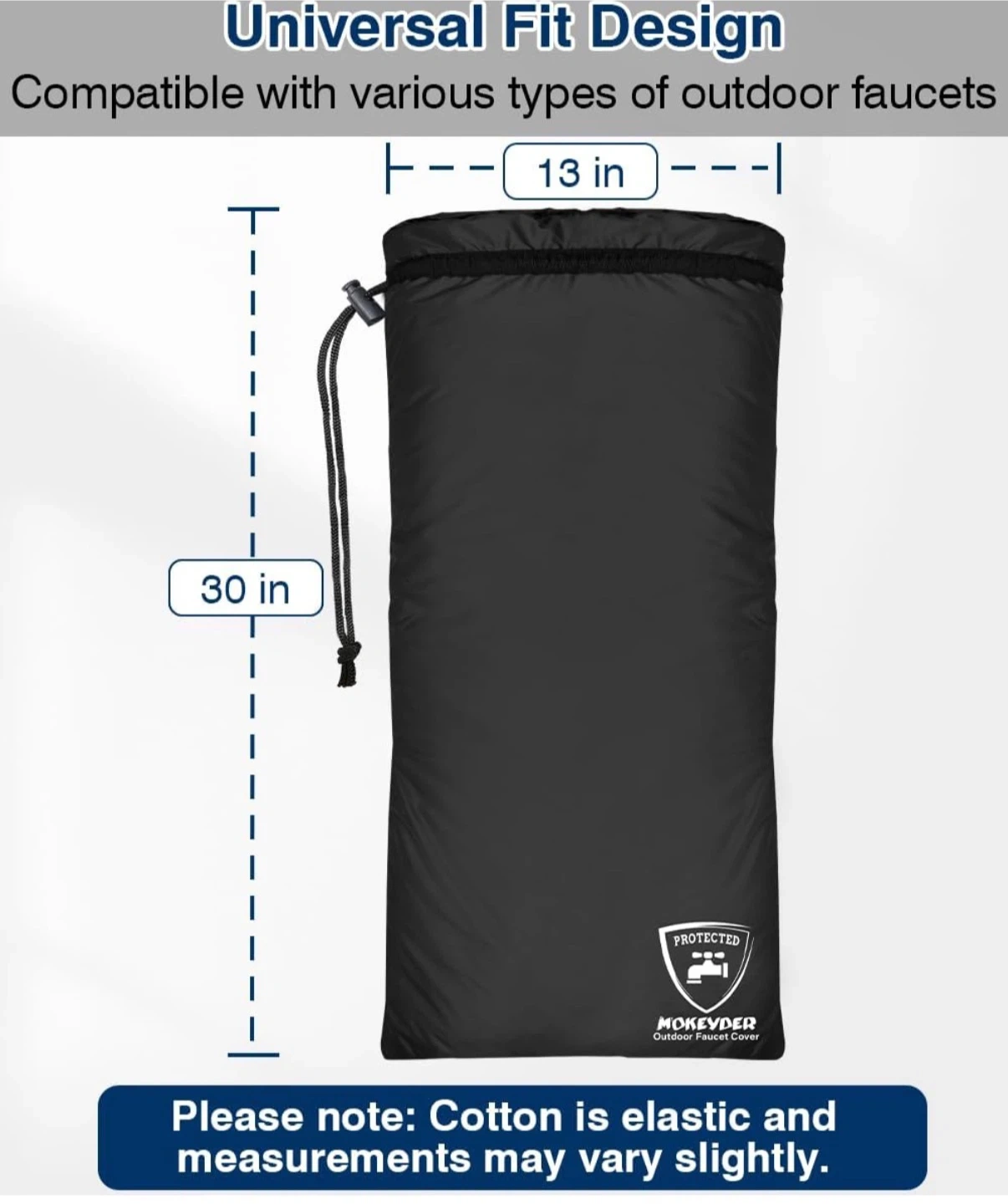 Keep your outdoor faucets protected from freezing with this faucet cover! It's designed to fit various types of outdoor faucets and provides superior insulation performance. The cover is made with waterproof fabric and insulated cotton, ensuring your faucets are safe from damage caused by freezing. It's also easy to install and remove with its convenient string tie design. Dimensions are 30 inches in length and 13 inches in width. Only available for pick up.
