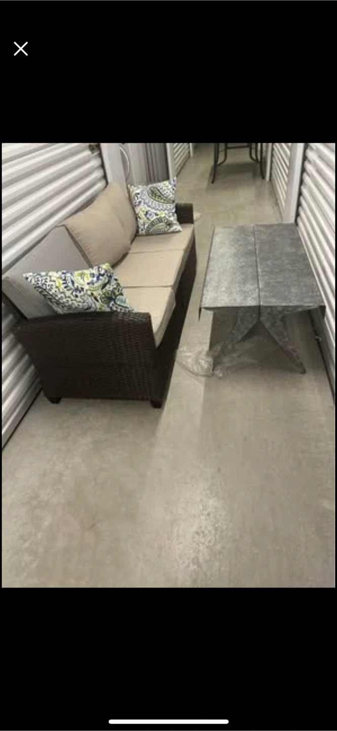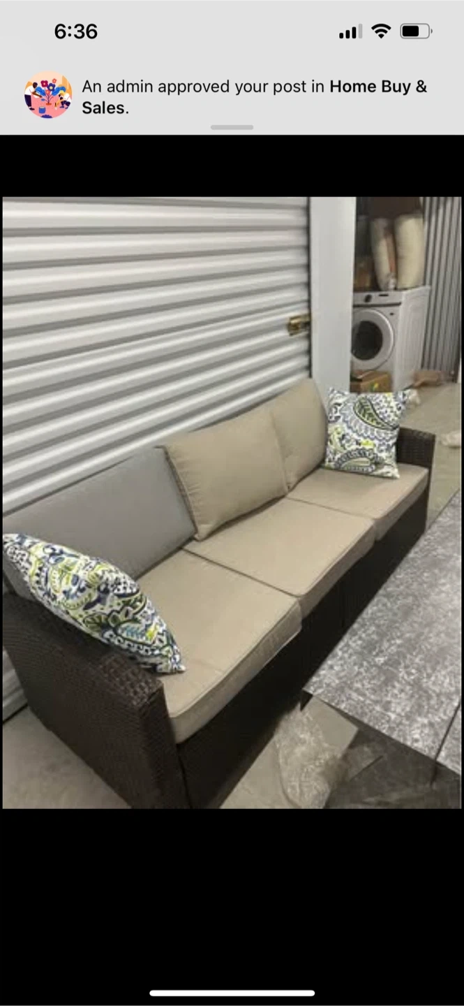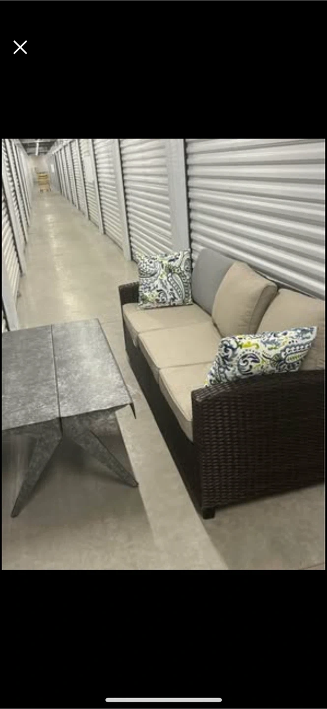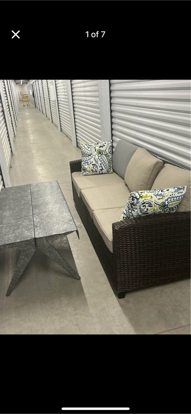 Selling a lovely outdoor patio set! Includes a comfortable sofa with cushions and a stylish table. Perfect for enjoying the nice weather in your backyard or on your balcony