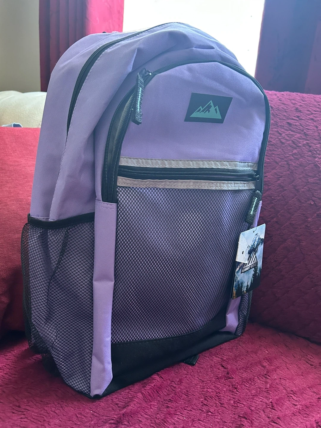 I'm selling a brand new Ozark Trail backpack in a lovely lavender colour! Key features: - Dimensions: 12W x 18H x 7D - Reflective zip binding on the front panel - Rugged polyester fabrication - E-Z grip rubber handle - Dual side mesh water bottle pockets - Fully padded shoulder straps - Comfort padded back
