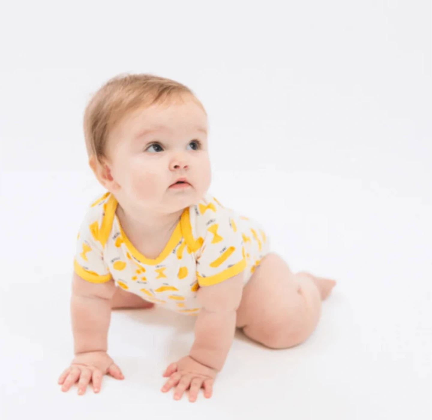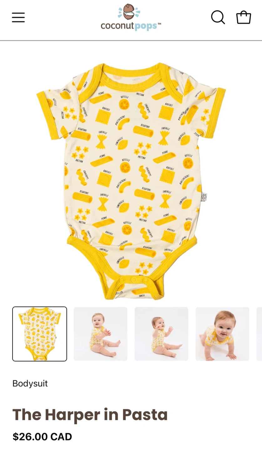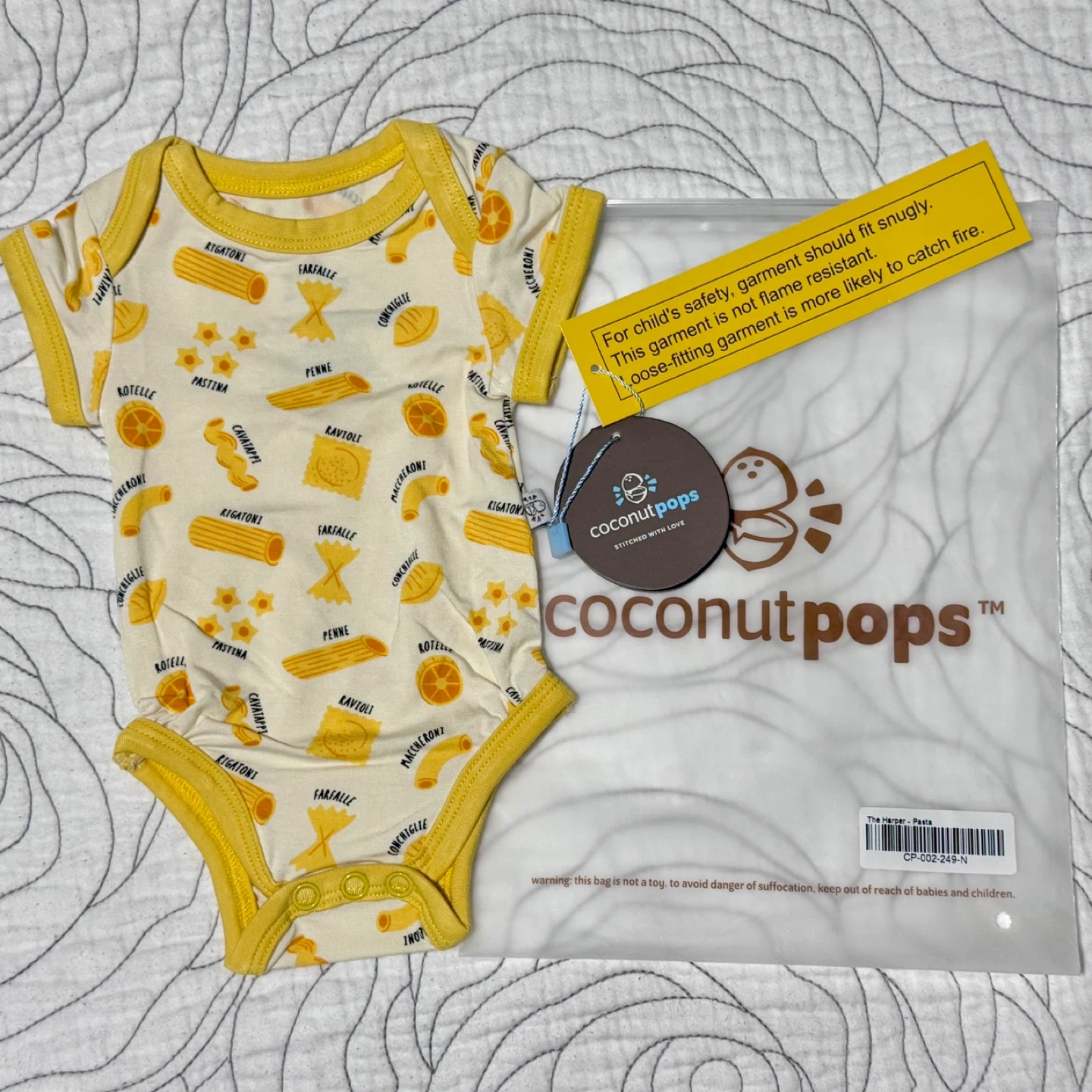 Brand new with original tags in packaging, never worn or tried on. Purchased as a gift but it’s the wrong size. Please review item photos for description and sizing info. Size: Newborn Fit: Small I paid $26 + $16 shipping to Canada This adorable Coconut Pops 'The Harper' bodysuit in the pasta print is perfect for your little one! It's made from a super soft bamboo blend (95% viscose from bamboo + 5% spandex) that feels like cream on gentle skin. The fabric is stretchy and breathable, making it comfy for all four seasons. Easy-snap buttons make diaper changes a breeze, and the elastic leg holes help hide the diaper.