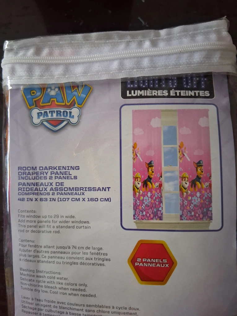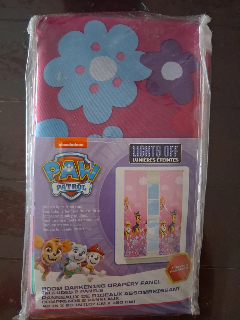 I have a brand new Paw Patrol room darkening drapery panel for sale! It comes with two panels, each measuring 42 inches by 63 inches (107 cm x 160 cm). These panels are designed to fit windows up to 29 inches wide. It blocks light from room and increase quality of sleep and reduce level of stress. The original packaging is included! Cash only, Pick up only, no delivery.