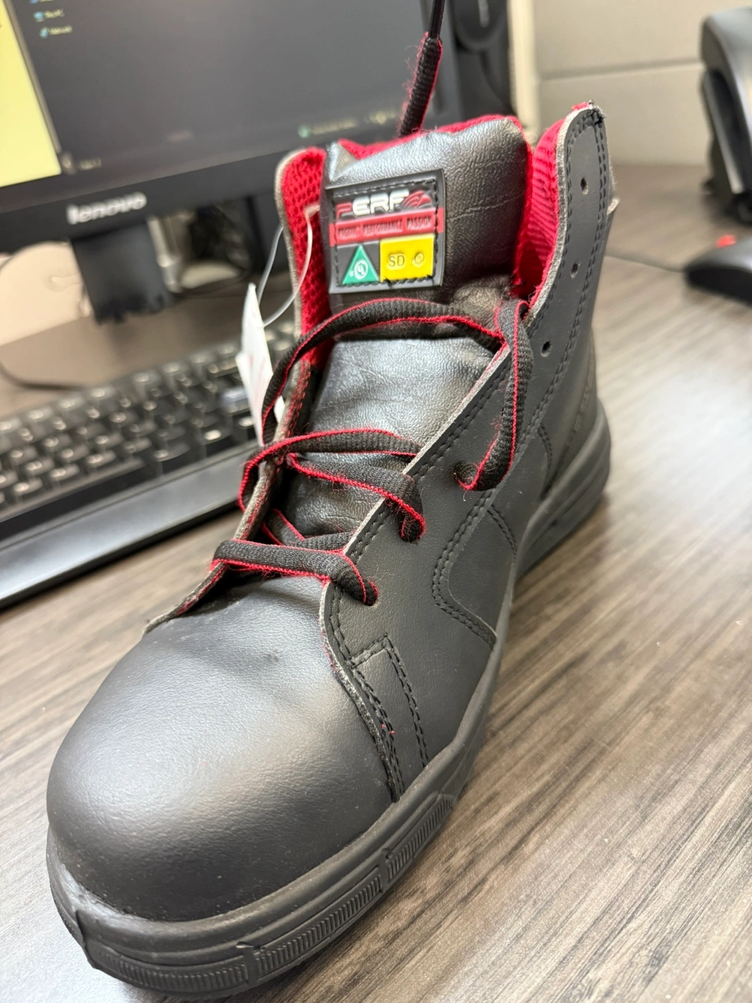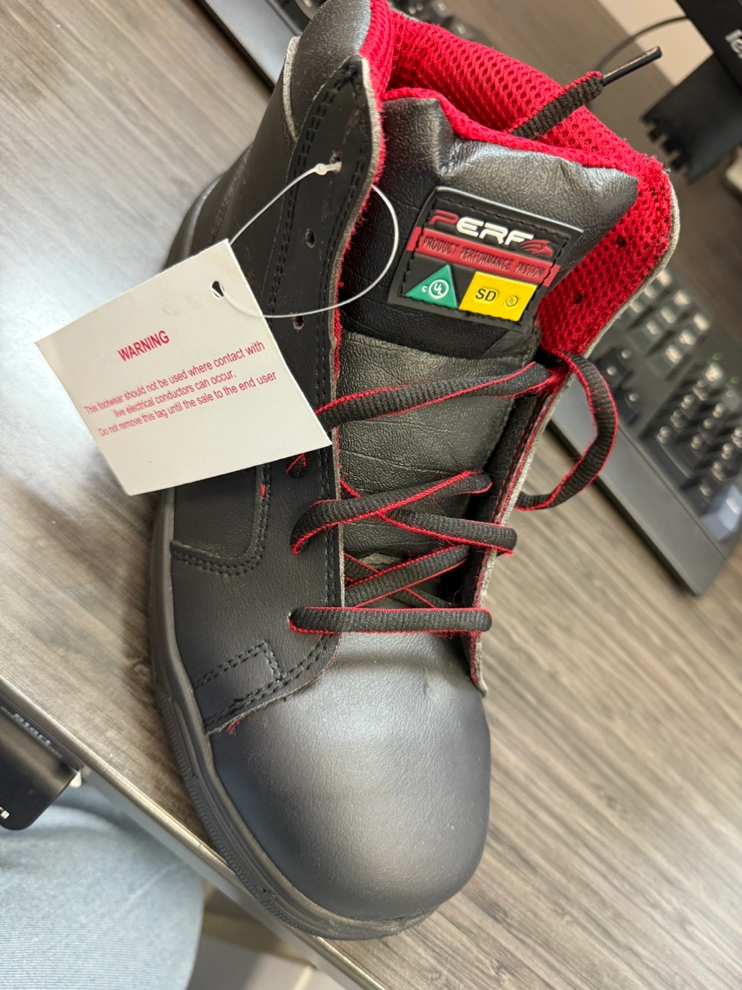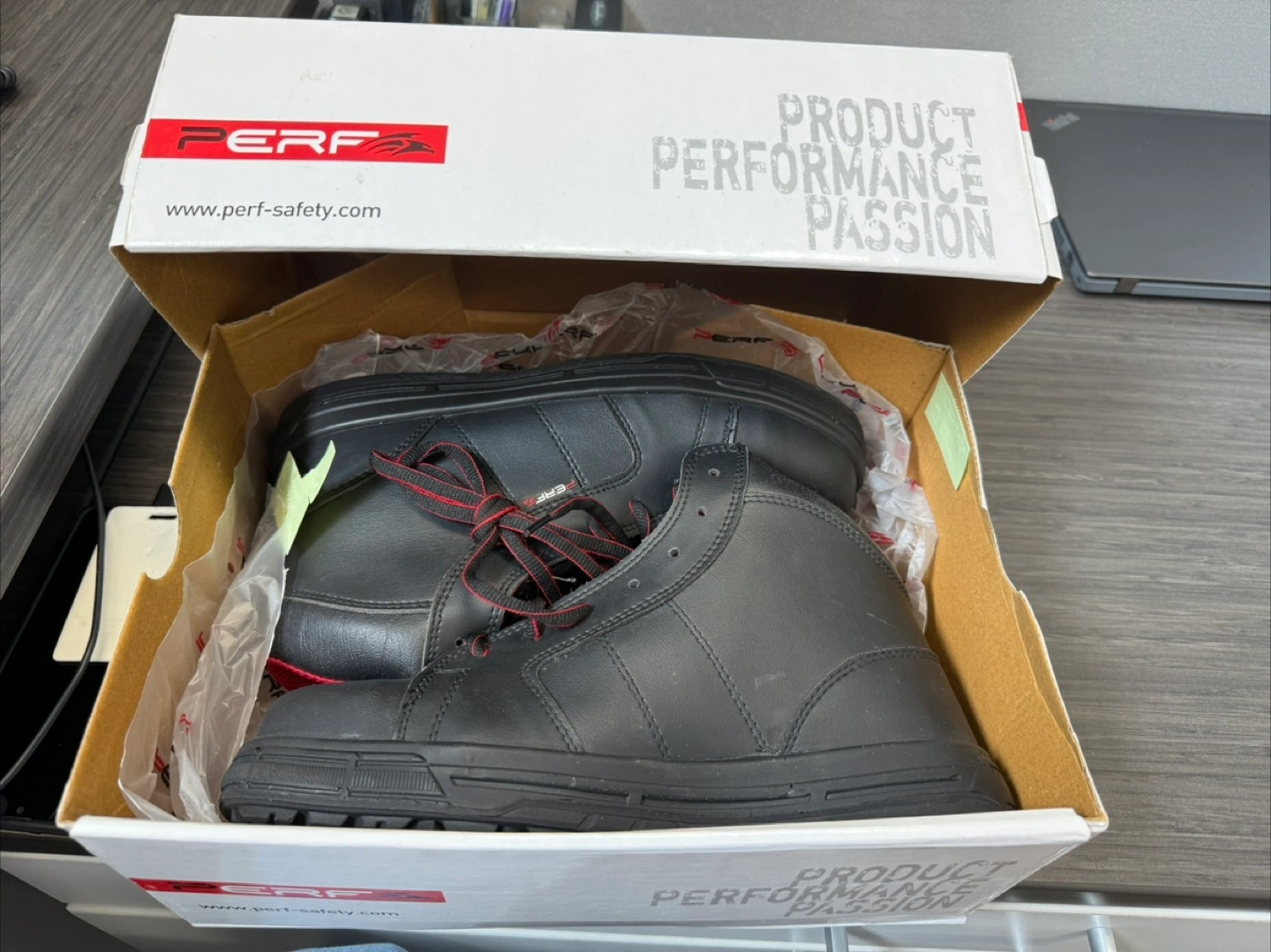 I'm selling a pair of new PERF safety boots in black. They come in the original box. These are great for anyone needing reliable foot protection on the job!