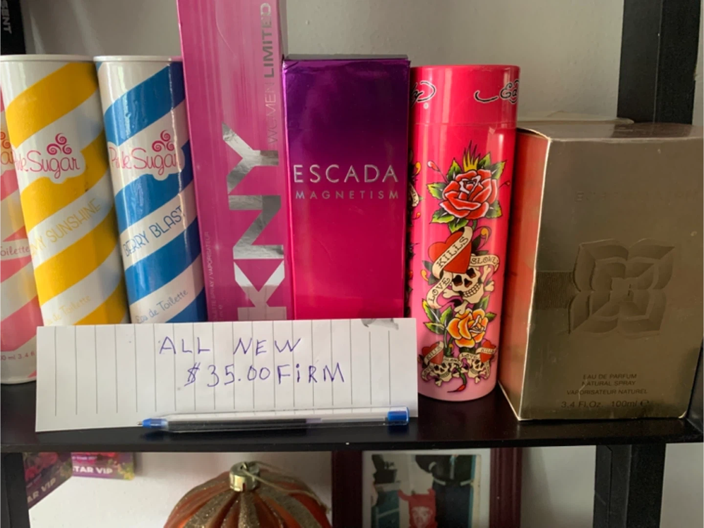 Selling a collection of new perfumes! Includes: $35.00 each. Firm - Pink Sugar Berry Blast Eau de Toilette - Pink Sugar Eau de Toilette My Sunshine - Escada Magnetism - Ed Hardy Love Kills Slowly Eau de Parfum - DKNY Women Limited Edition All are brand new and ready to find a new home. Only cash exchanges